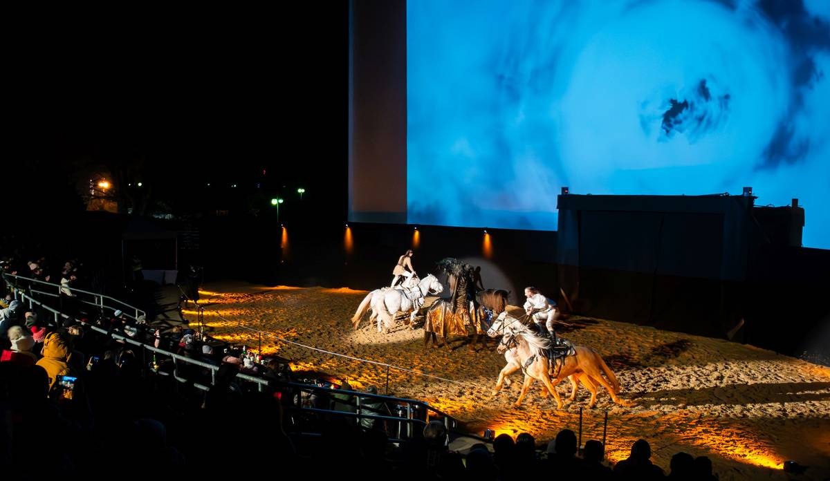 Michal Bednář a Natálie Nováková předvádějí na koních cvik - tzv. uherskou poštu.