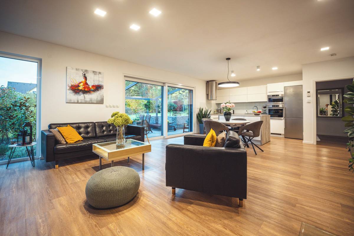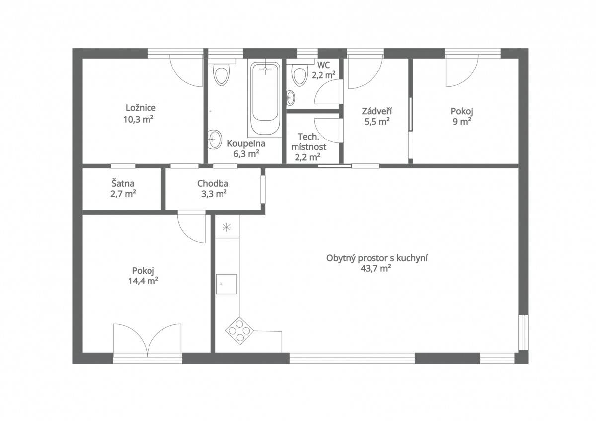 Obytný prostor zaujímá až 43,7 m2 a spojuje kuchyni, jídelnu i samotný obývací pokoj