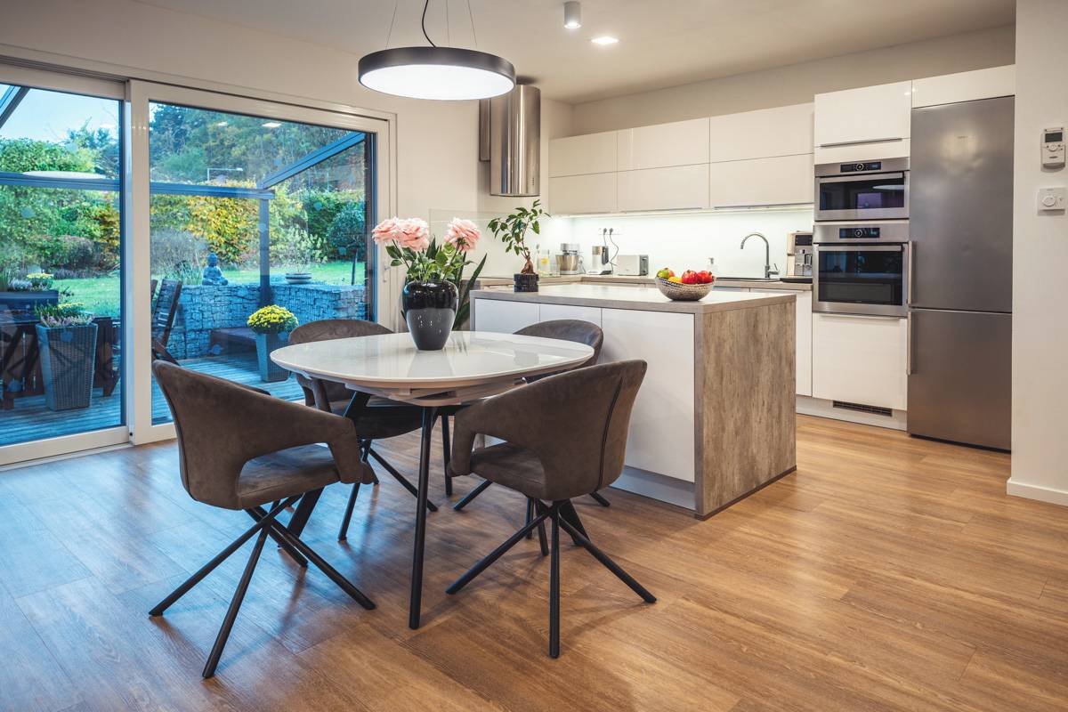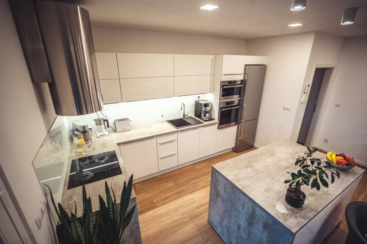 Kuchyni s obývacím pokojem mají navrženou dohromady. „Chtěli jsme to tak. V bytě jsme měli obývák, kde kuchyně byla za rohem. Když jsme měli návštěvu a člověk něco připravoval, byl schovaný za rohem a nemohl komunikovat s návštěvou. Tady je to takové, že můžeme cokoli připravovat a zároveň můžeme být pořád s návštěvou,“ odůvodňuje Petr