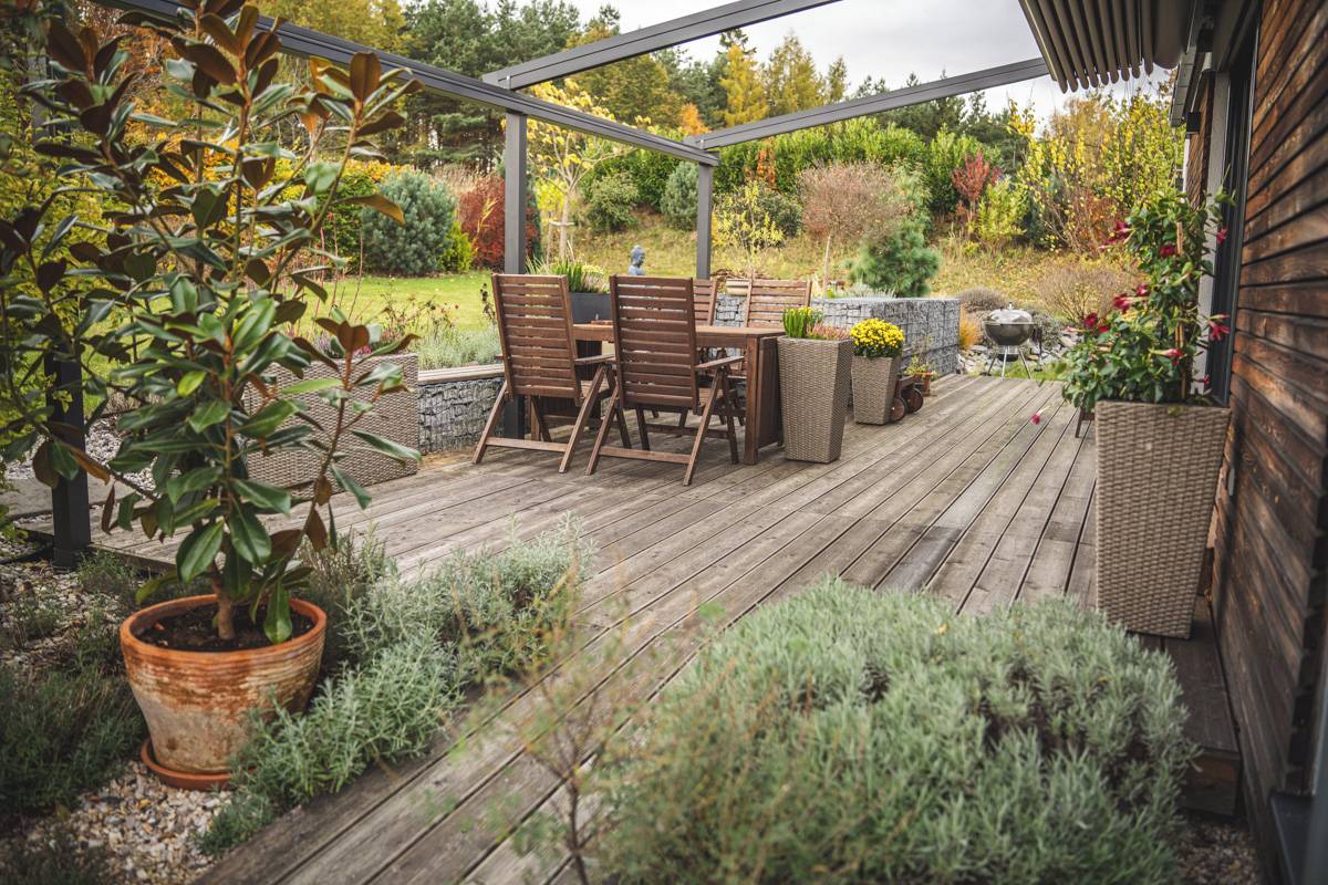 Zahradní pergolu si majitelé velmi vychvalují. V létě báječně stíní a naopak i v sychravém počasí umožňuje sezení venku