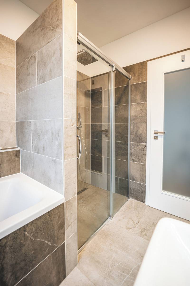 Součástí moderní koupelny je vana i sprchový kout walk-in, který si majitelé nemohou vynachválit