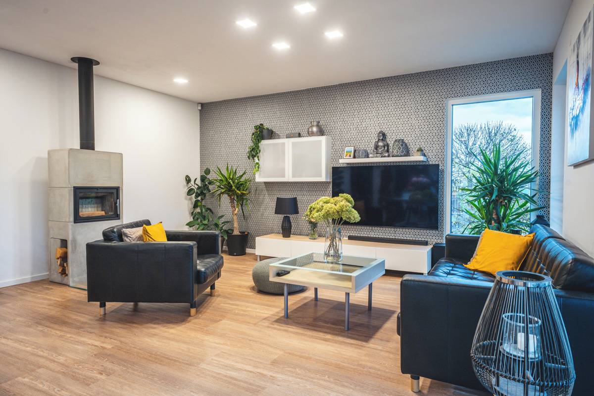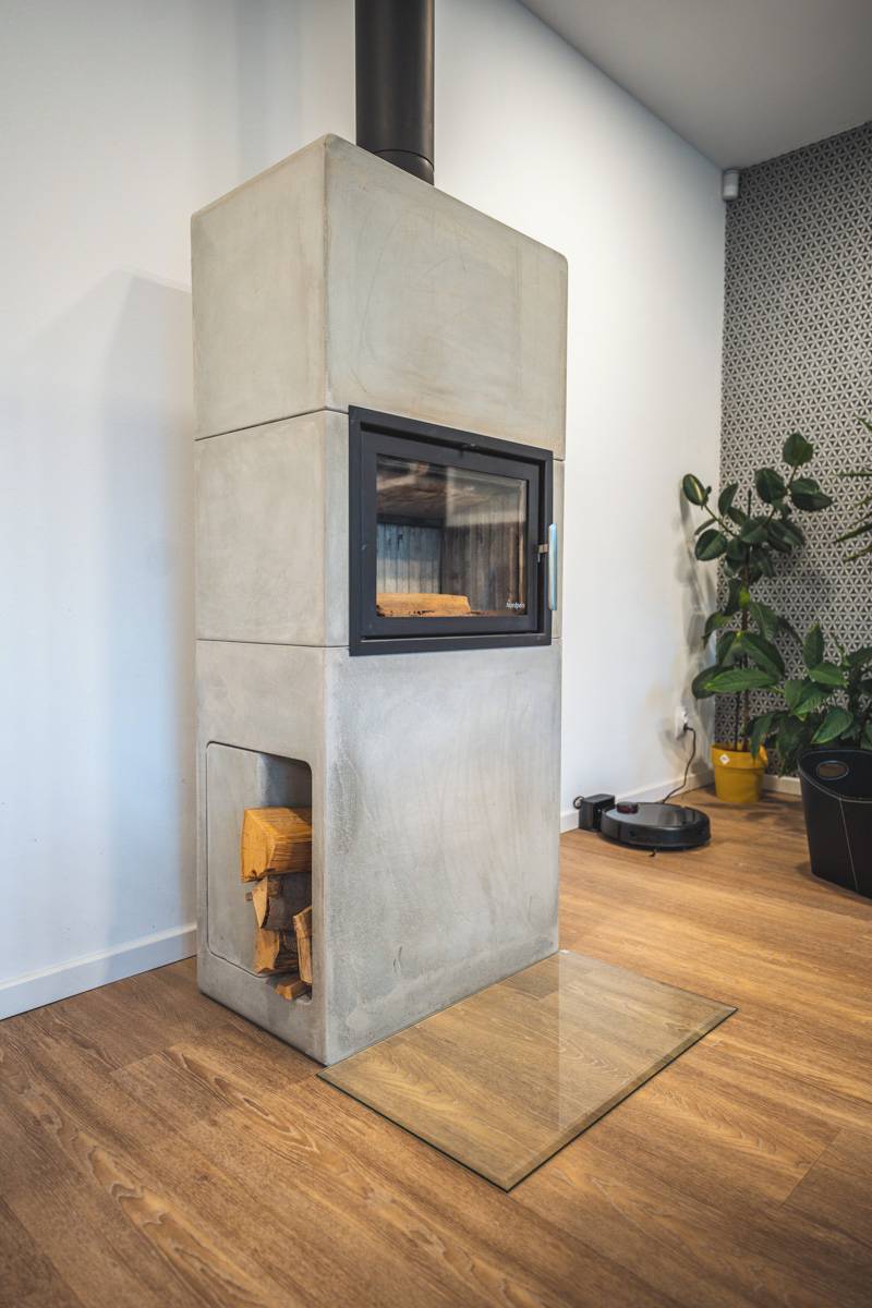 Dominantou obývacího pokoje jsou stylová krbová kamna z betonových dílů