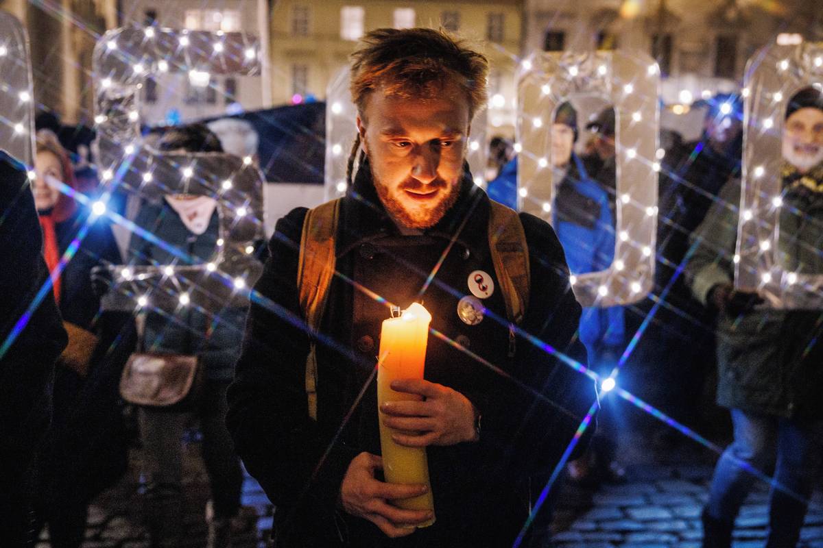 Účastníci akce Světlo na Hrad se sešli v horní části Malostranského náměstí před kostelem sv. Mikuláše a průvodem došli až na Hradčanské náměstí.