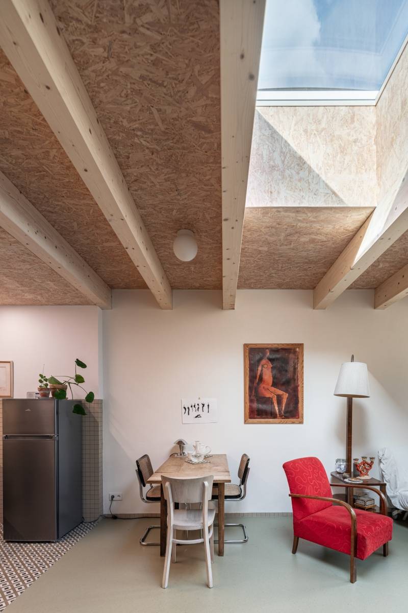Interiér přístavby zalévá světlo ze střešního světlíku.