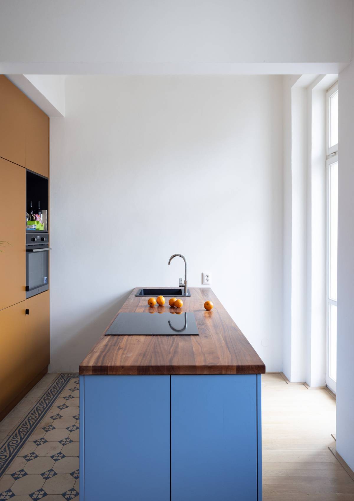 Kuchyň má nevšední barevnost.