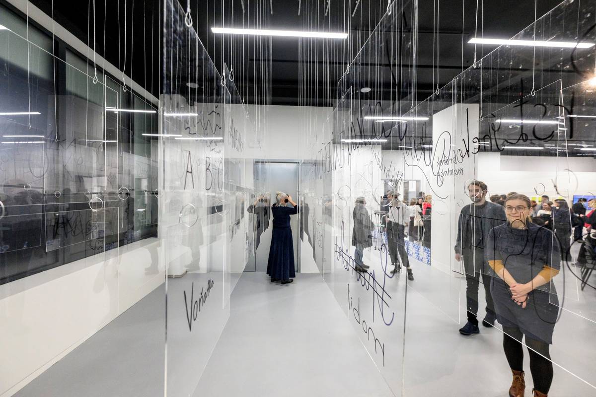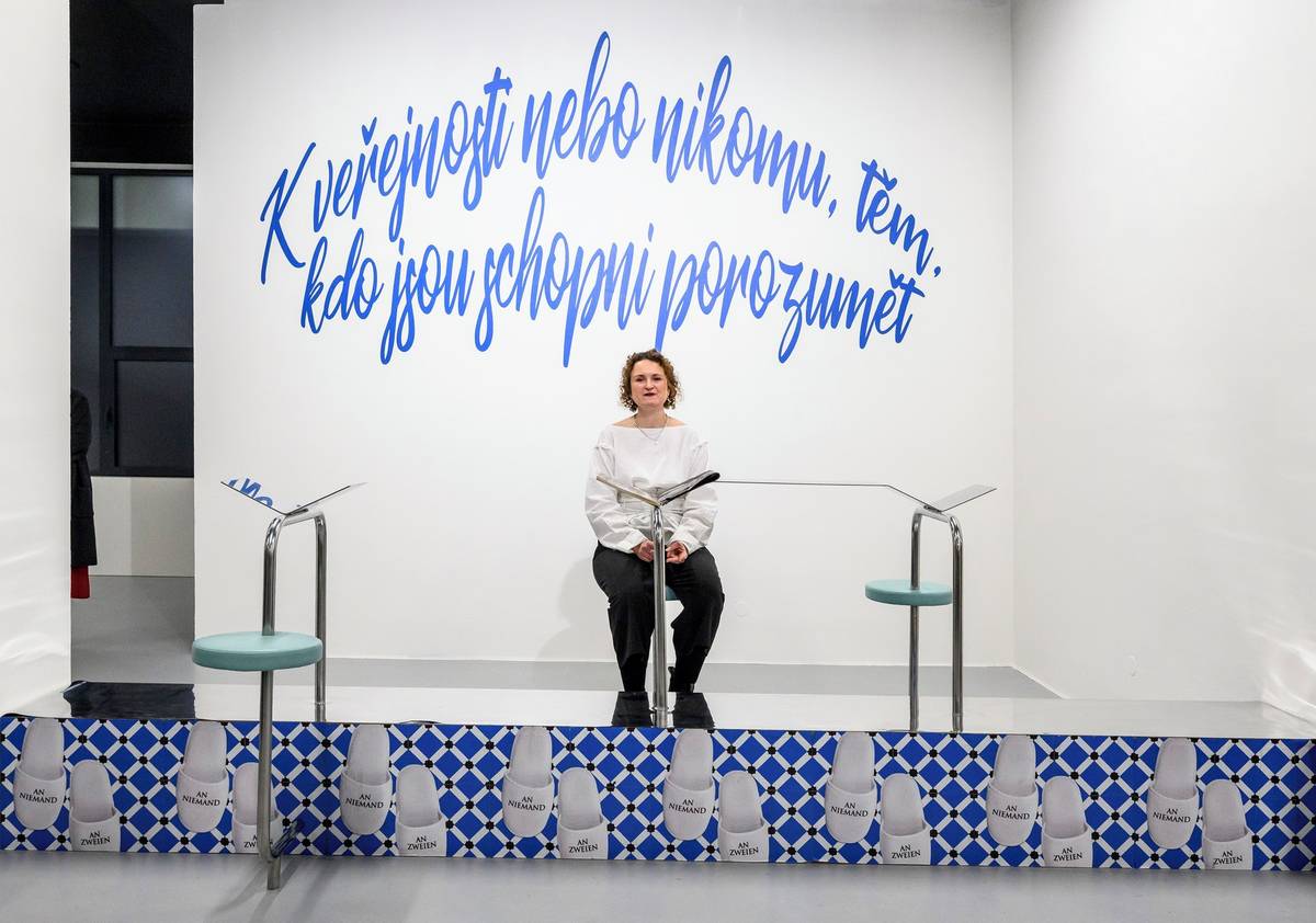 Na fotografii z výstavy Sdílené existence, kterou hostí Dům umění Ústí nad Labem, je kurátorka Petra Widžová v instalaci To Nobody and Two od skupiny Slavs and Tatars.