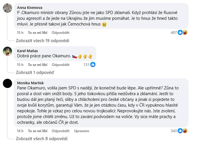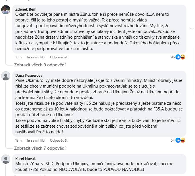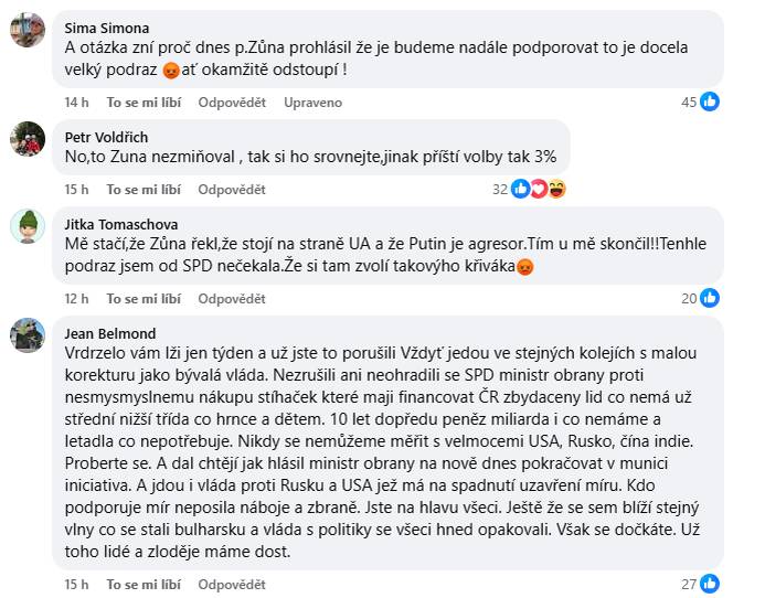 Na facebooku strany SPD a Tomia Okamury vzbudilo vyjádření ministra Zůny poprask.
