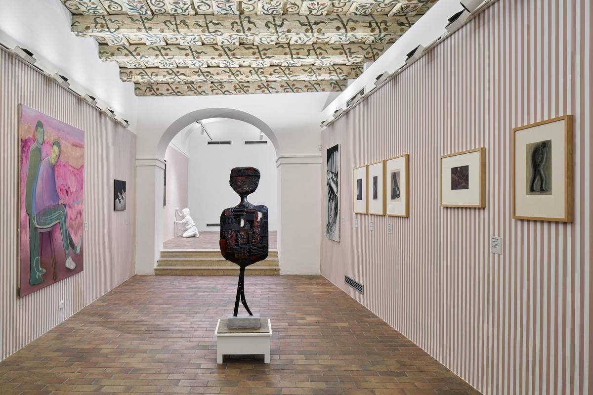 Vlevo vzadu jsou dvě díla Jiřího Davida, vpravo bronzová plastika Arona Demetze.