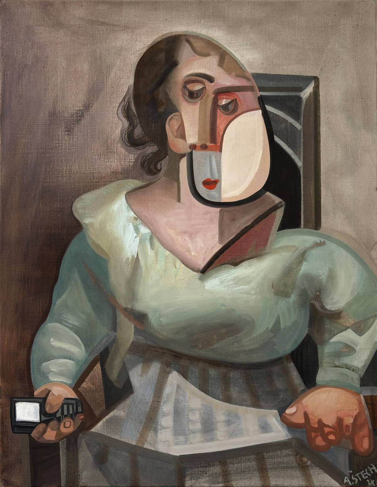 Adam Štech: Žena s telefonem, 2024, olej na plátně.