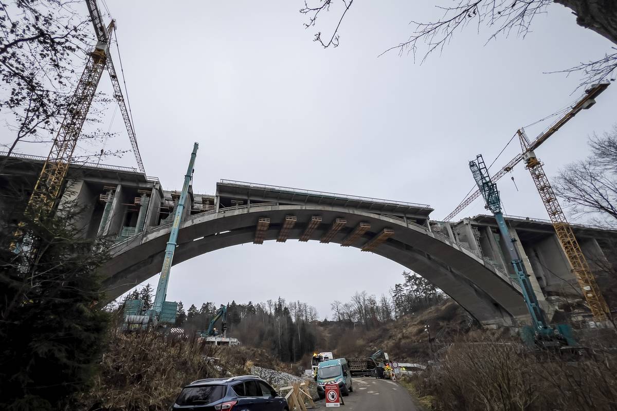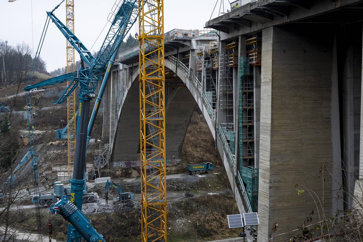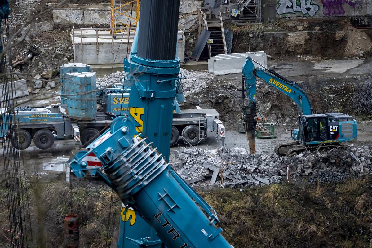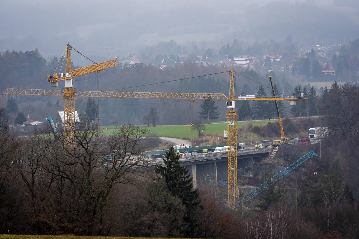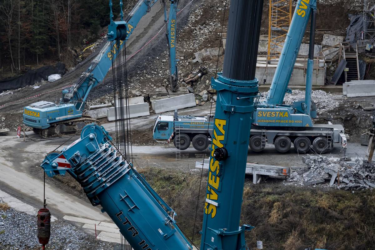 Materiál z demolované mostovky snáší jeřáby do údolí.