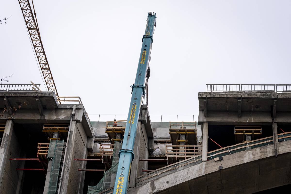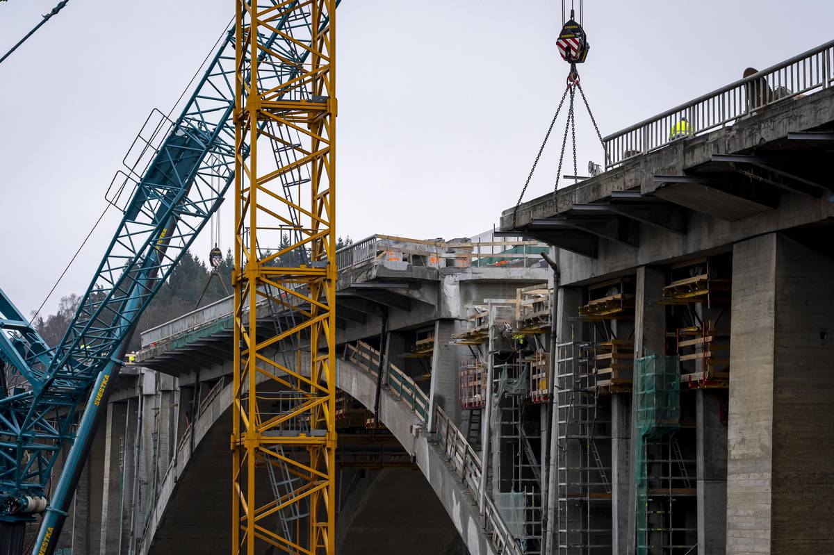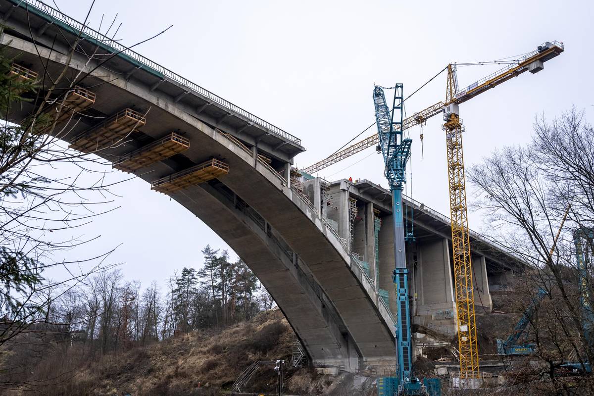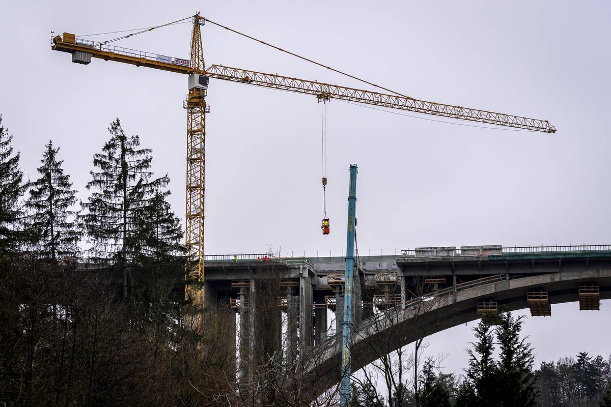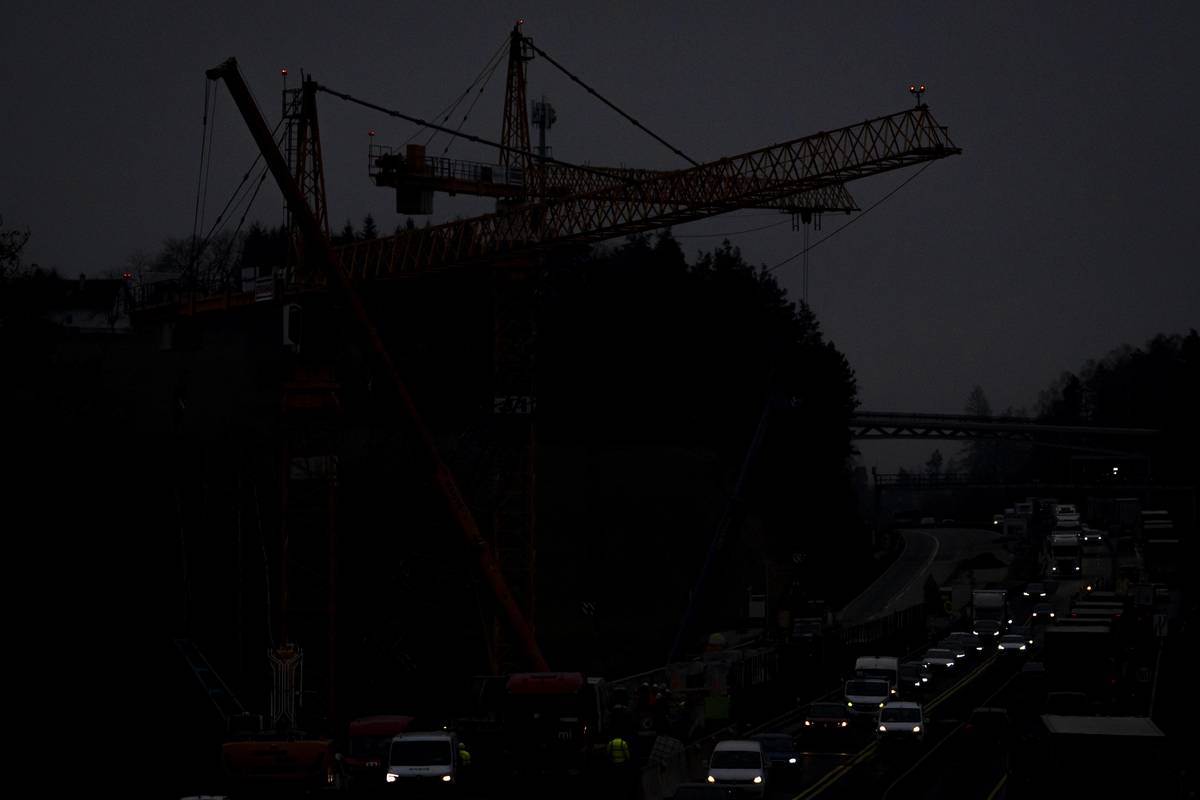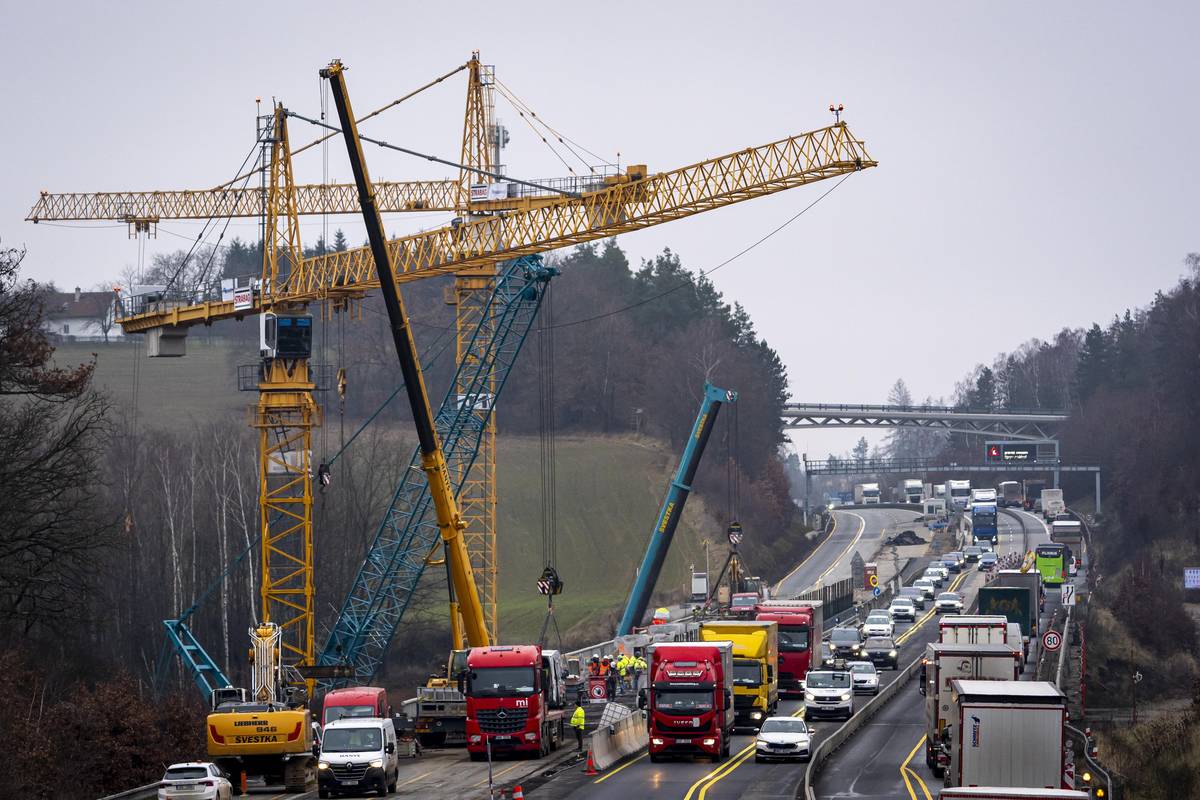 Materiál z demolované mostovky snáší jeřáby do údolí.