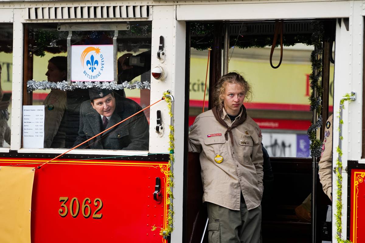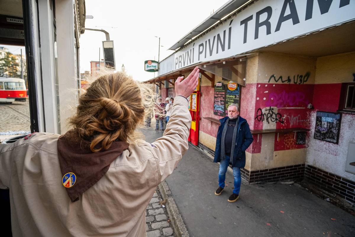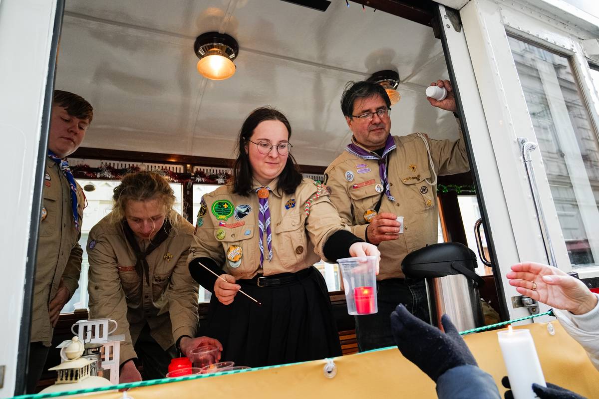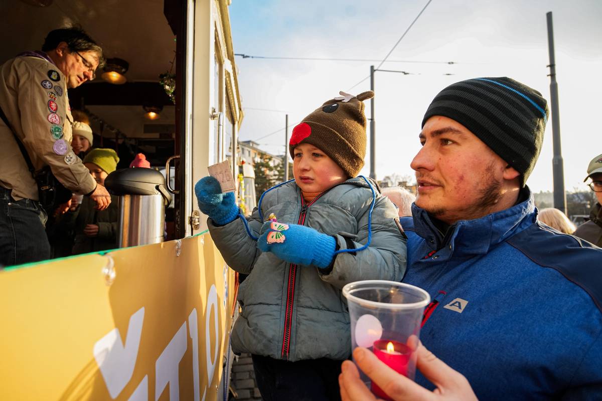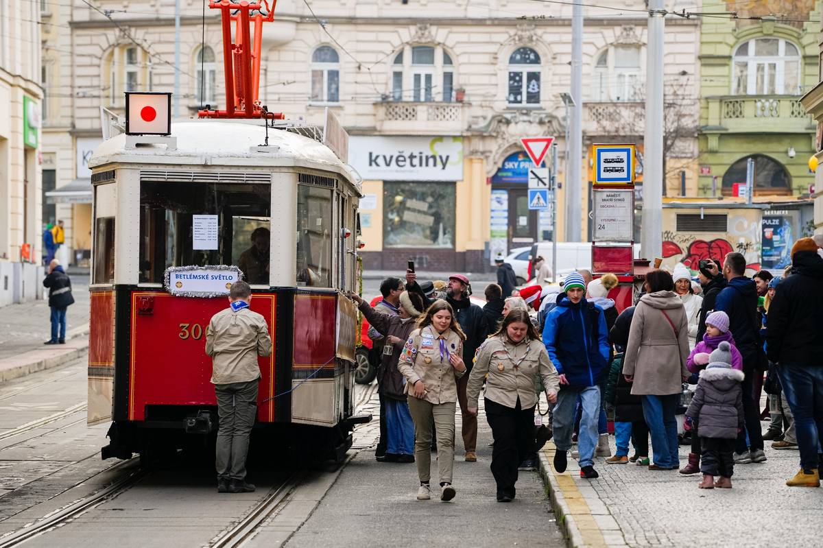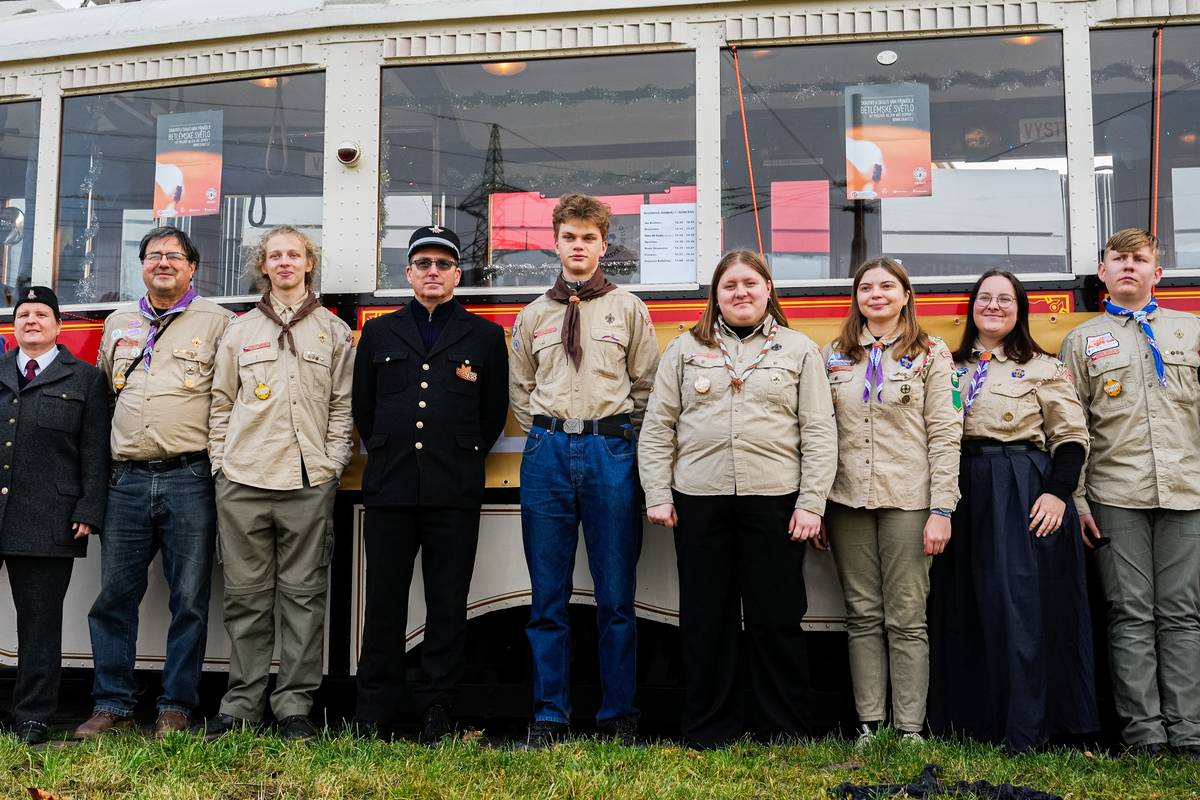 Skupina skautů, která rozdávala světlo na jedné z pražských linek.