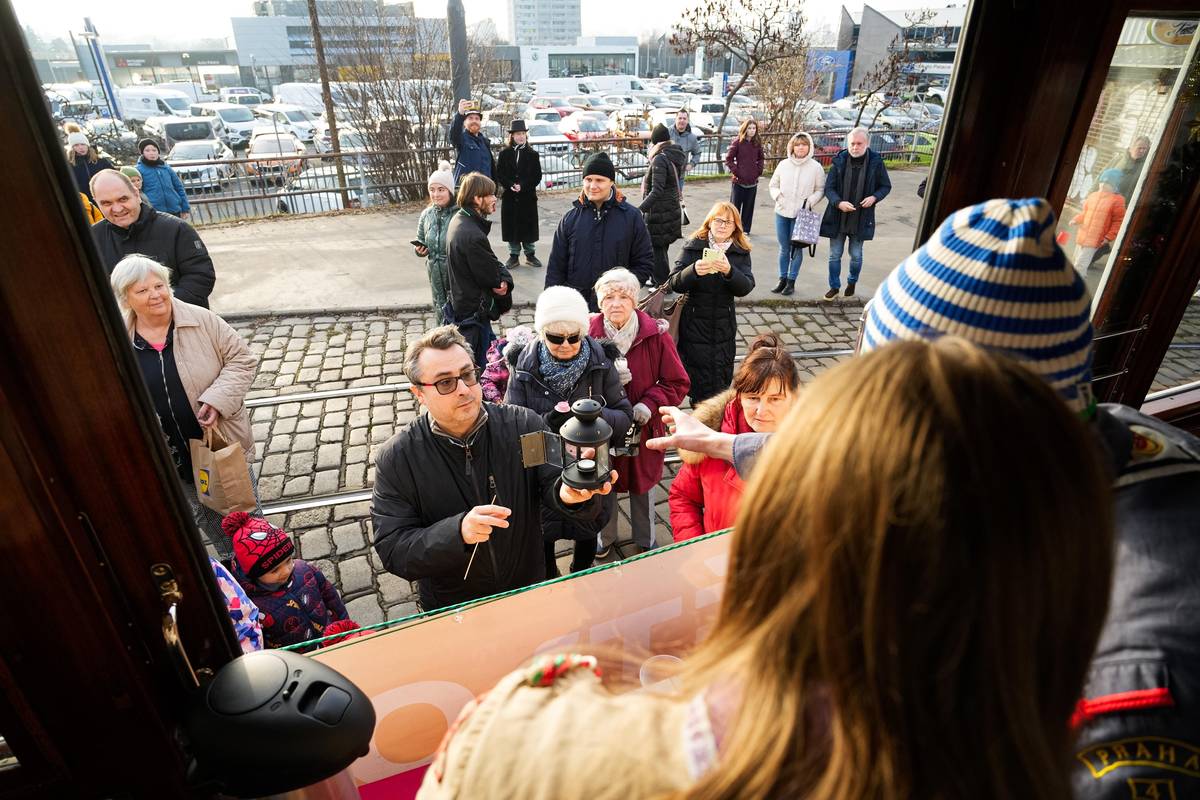 Historická tramvaj měla speciálního řidiče i průvodčí. Zároveň byla vánočně vyzdobená.