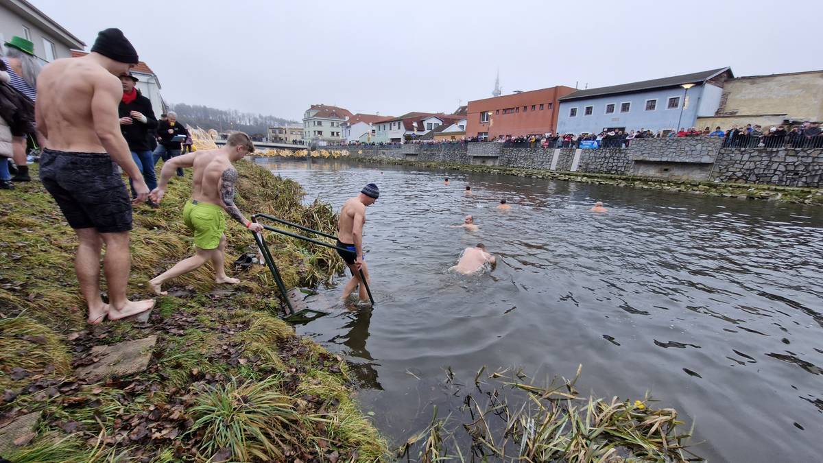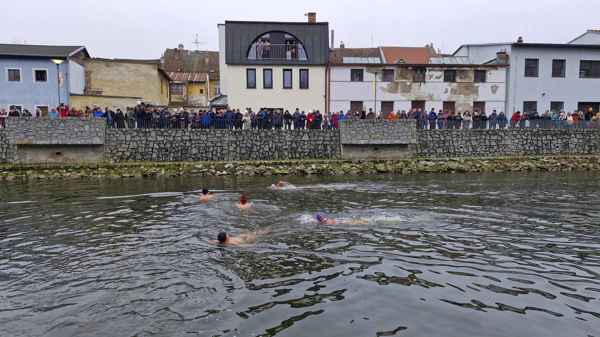 Tradičnímu propagační otužování v řece Jihlavě v centru Třebíče přihlížely davy lidí.