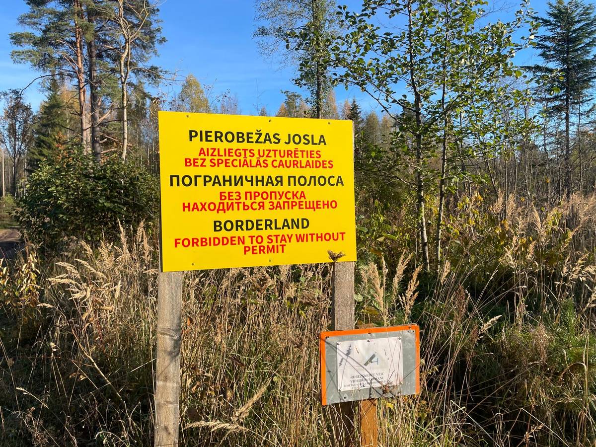 Cedule uprostřed lesů varuje, že se lidé nesmí k ruské hranici přiblížit.