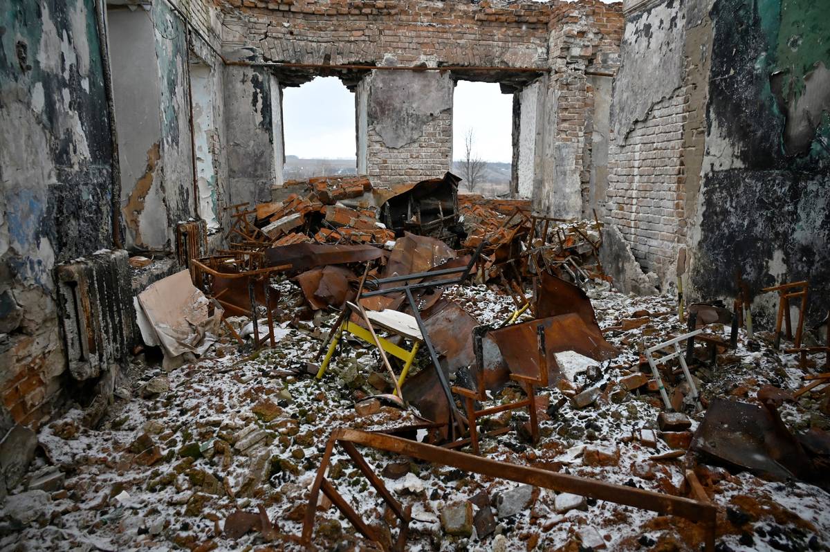 (Snímek zničené školy Cupivky v Charkovské oblasti, 1. března 2023.)