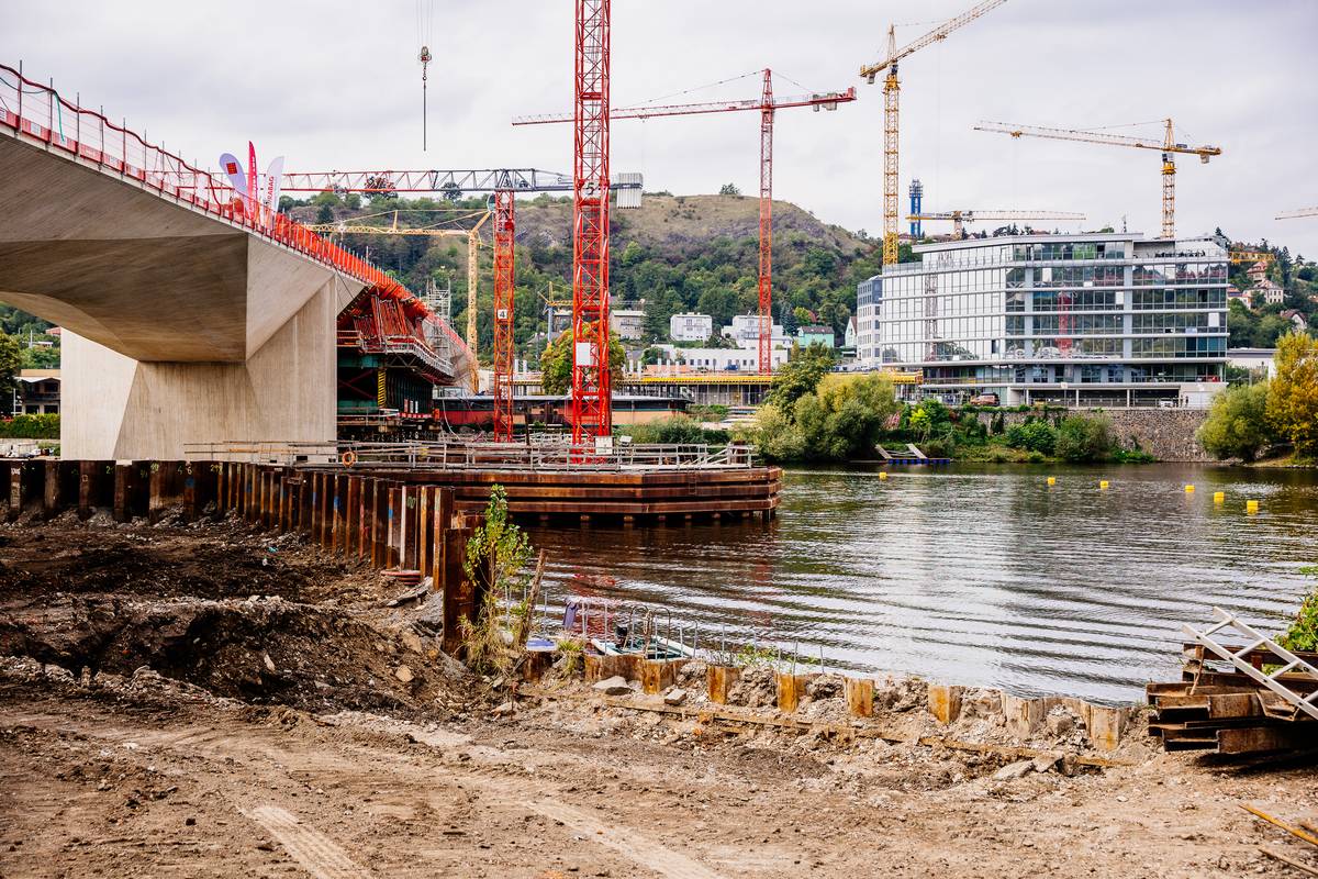 V okolí Dvoreckého mostu probíhá i další výstavba, a tak je panorama plné jeřábů.