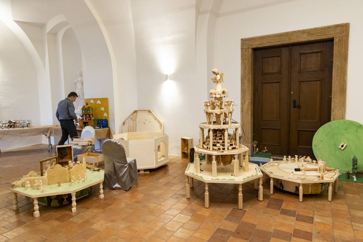 Vladimír Glaser připevňuje v předvečer otevření výstavy poslední figury do věže. Expozice se otevřela 20. prosince a potrvá až do 4. ledna. Celkově se tu představuje 87 různých betlémů, 12 z nich veřejnost uvidí poprvé.