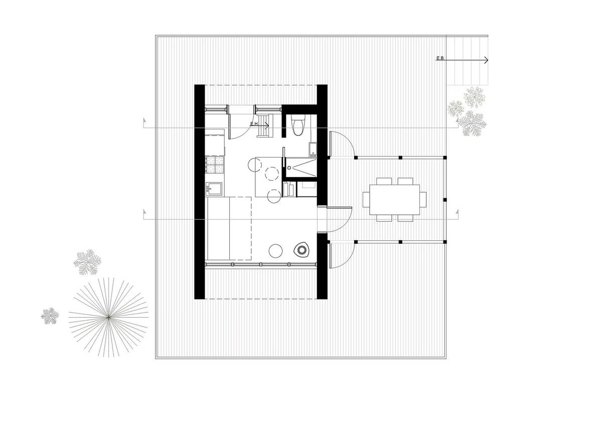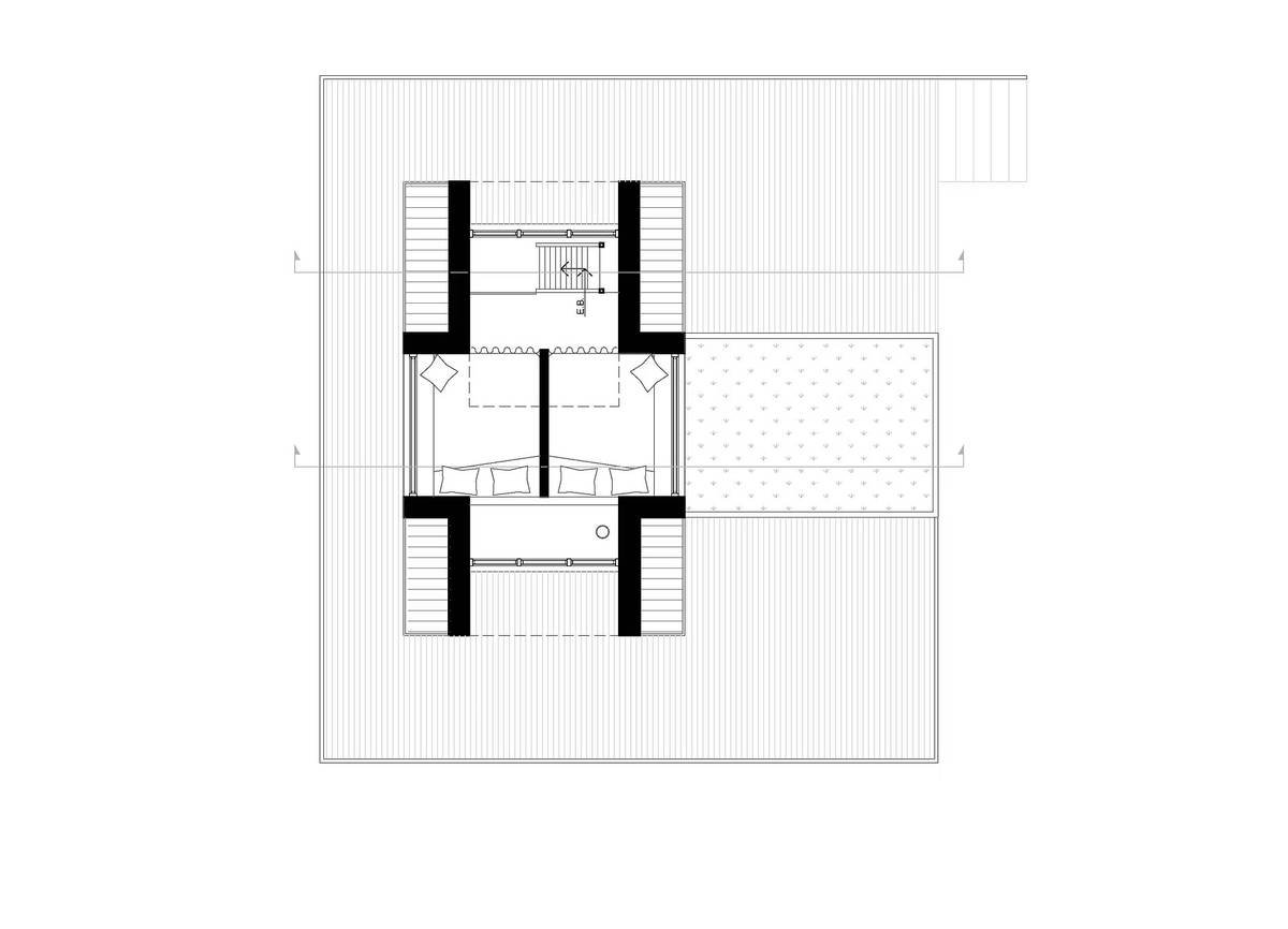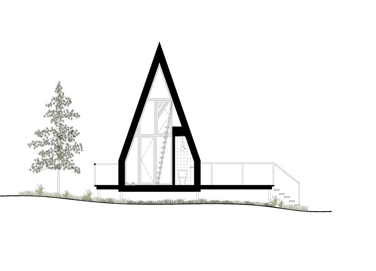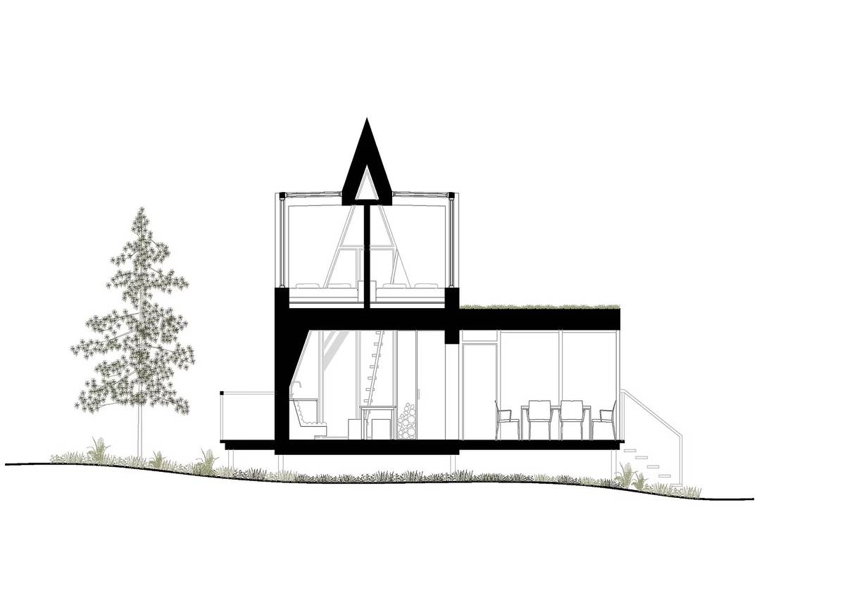 Chata je umístěná na vlastní plošině, zásah do krajina při její stavbě se tím minimalizoval.