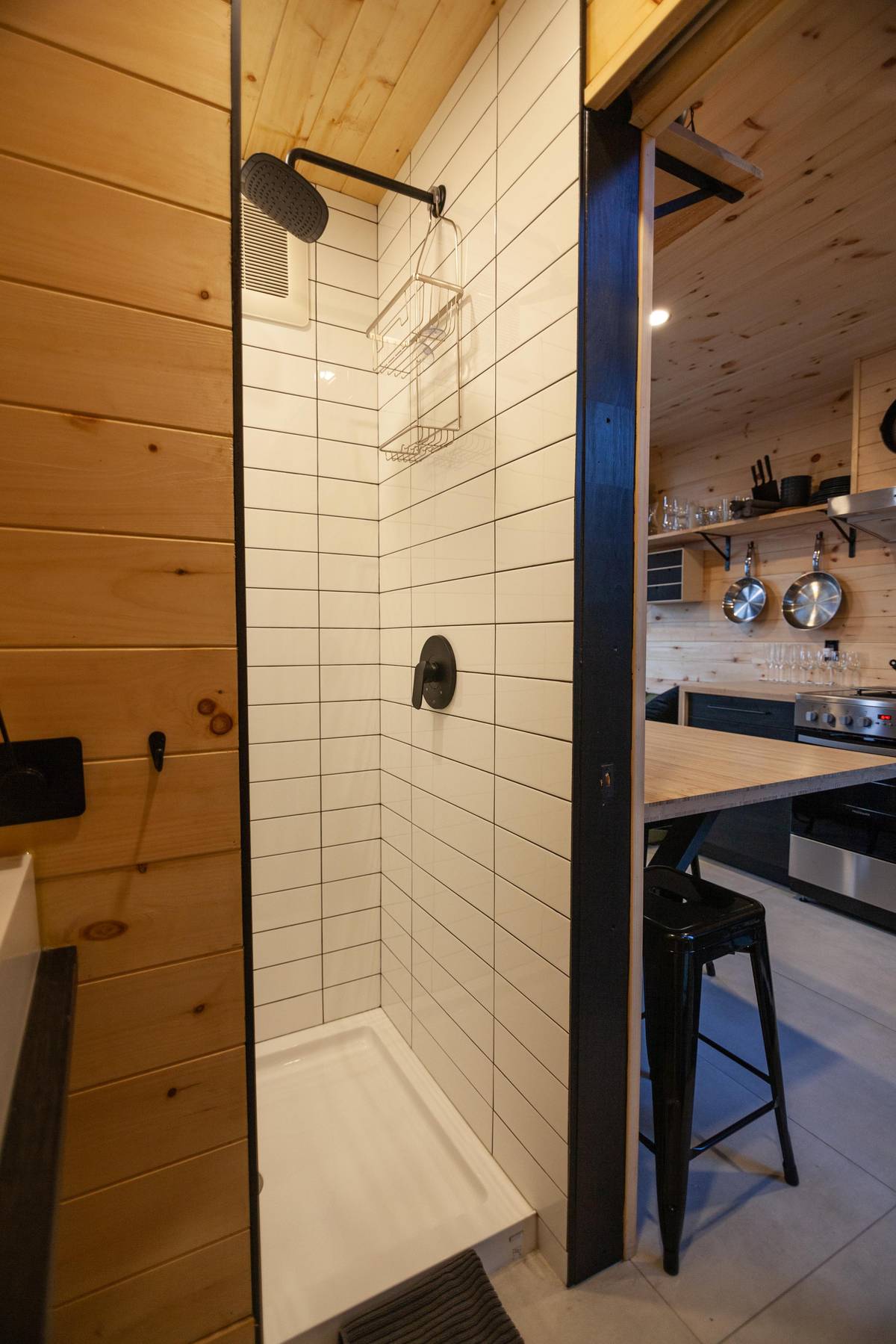 Malá koupelna je skryta v boxu vedle kuchyně.