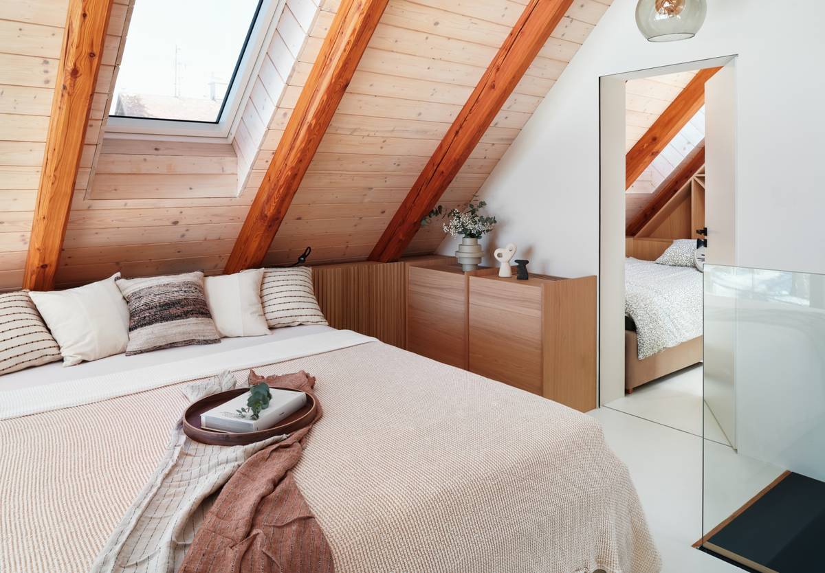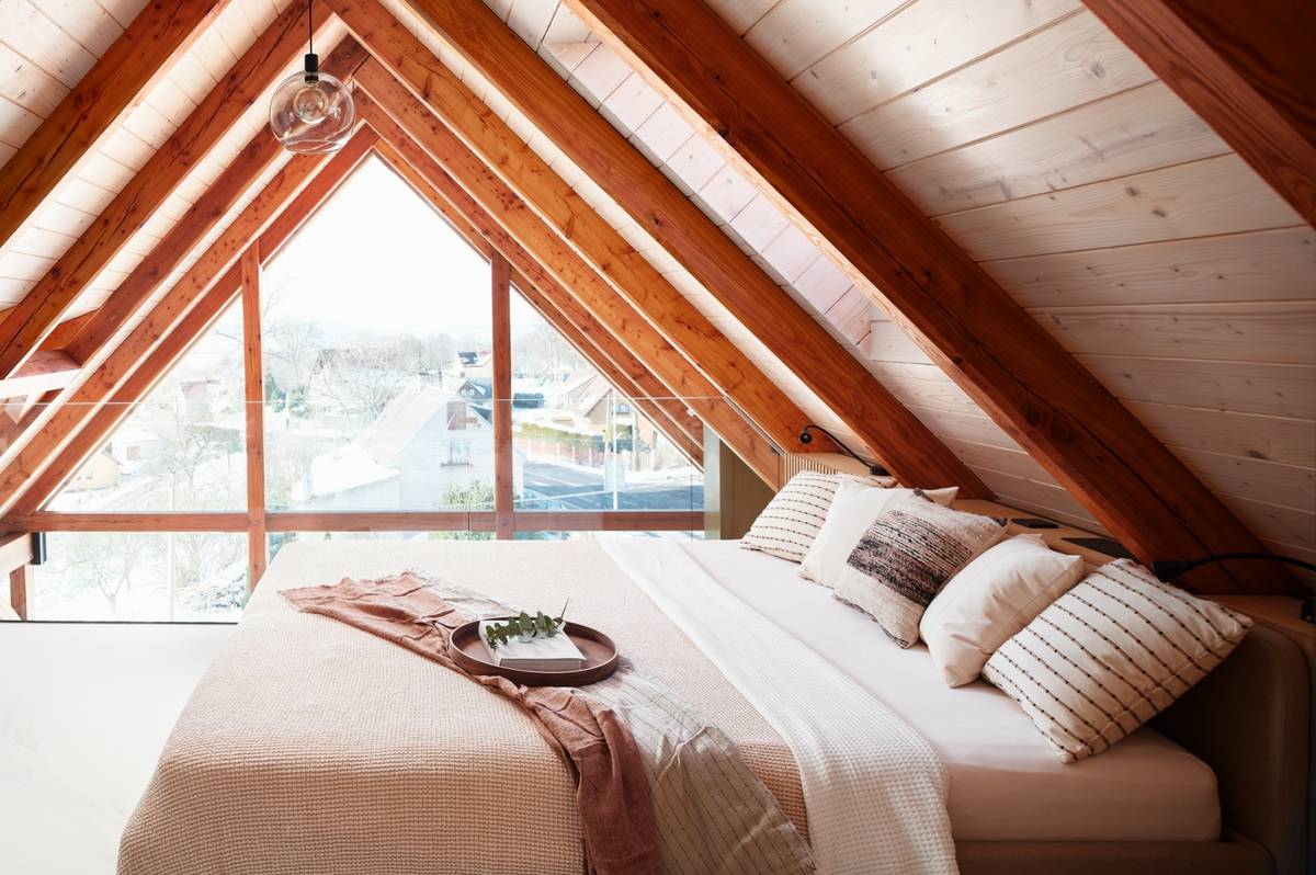 Prosklená štítová strana domu umožňuje výhled a spoustu světla i v ložnici umístěné v podkroví.