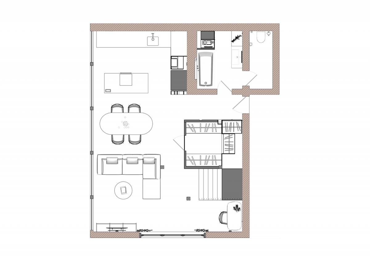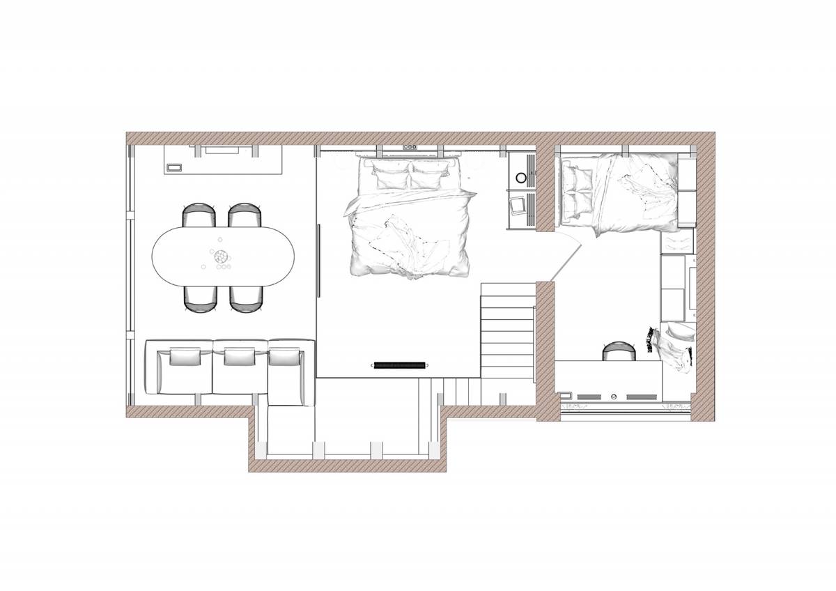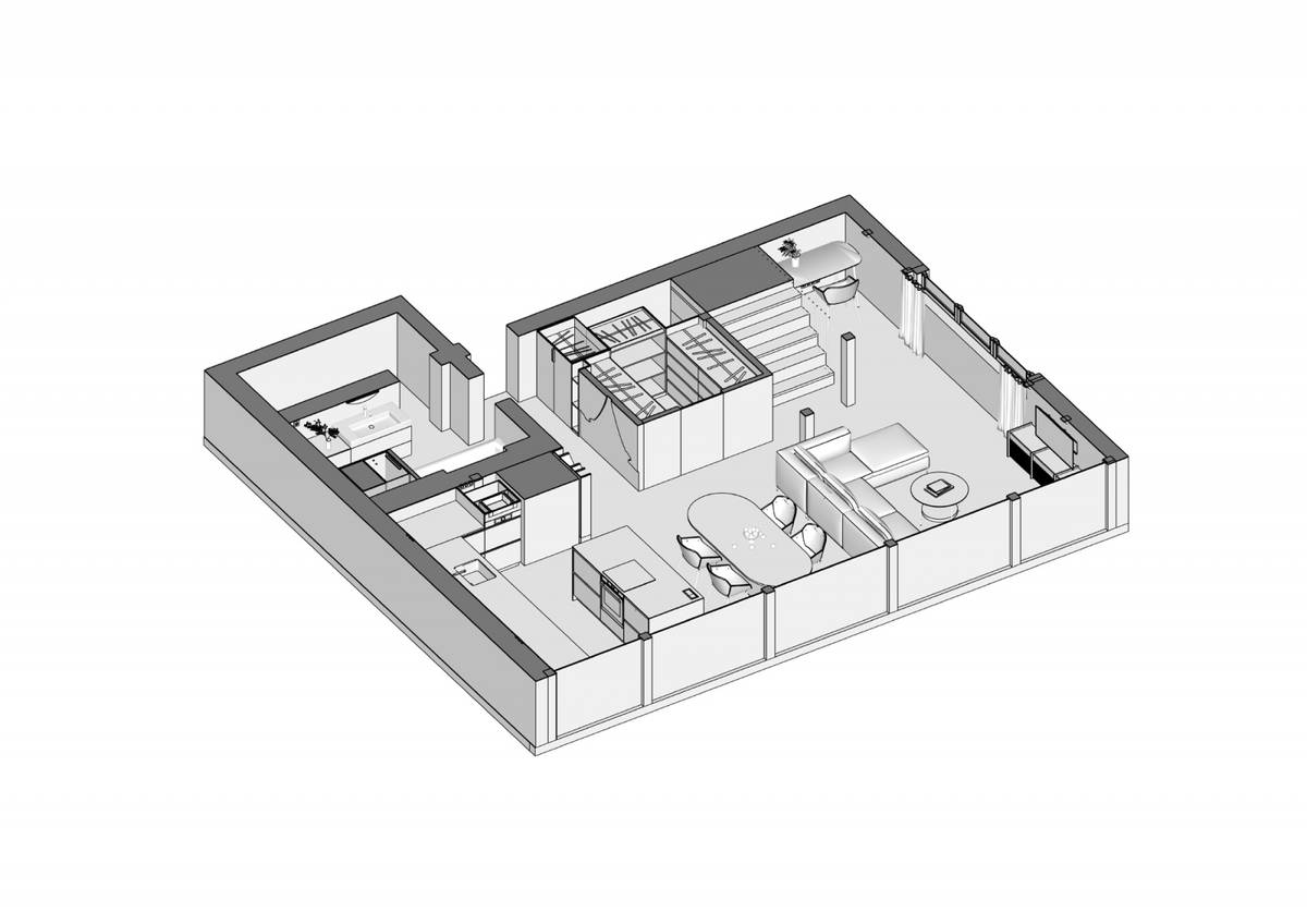 Trojrozměrný nákres uspořádání bytu - spodní podlaží