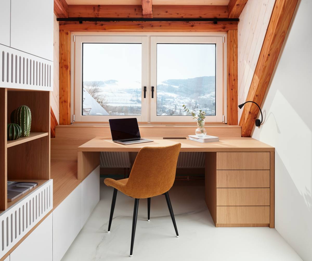Pracovní stůl a úložné prostory v dětském pokoji jsou spojené do jednoho celku.