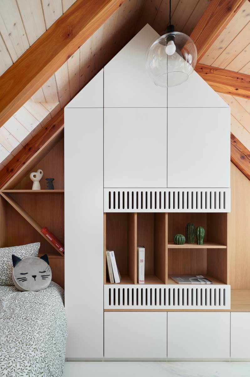 Designérka velice hezky vymyslela tvar skříně v dětském pokoji, která kopíruje tvar stropu a díky tomu vypadá jako domeček.