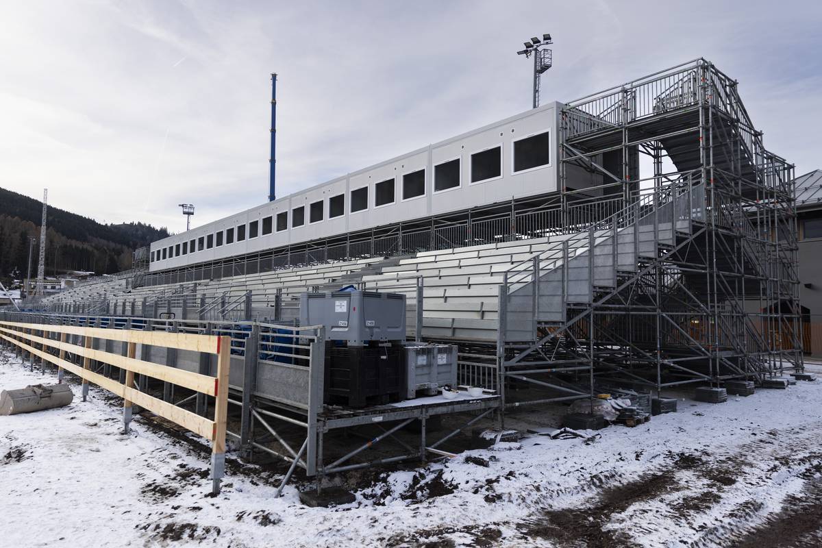 O pár kilometrů vedle se staví tribuny pro diváky biatlonu a běhu na lyžích.