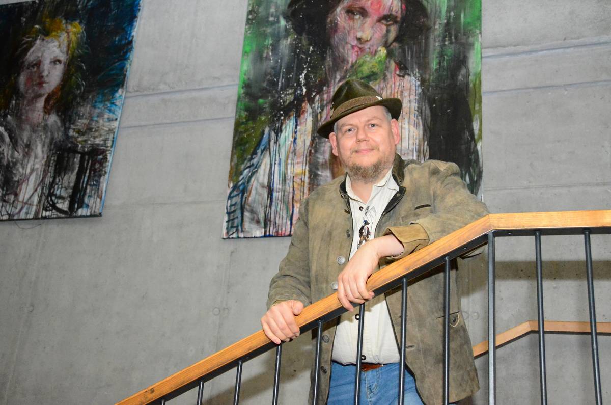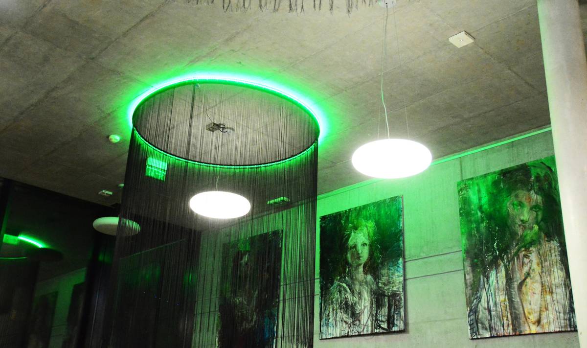 V říčanském centru Na Fialce si s vystavenými obrazy hraje i barevné nasvícení prostoru.