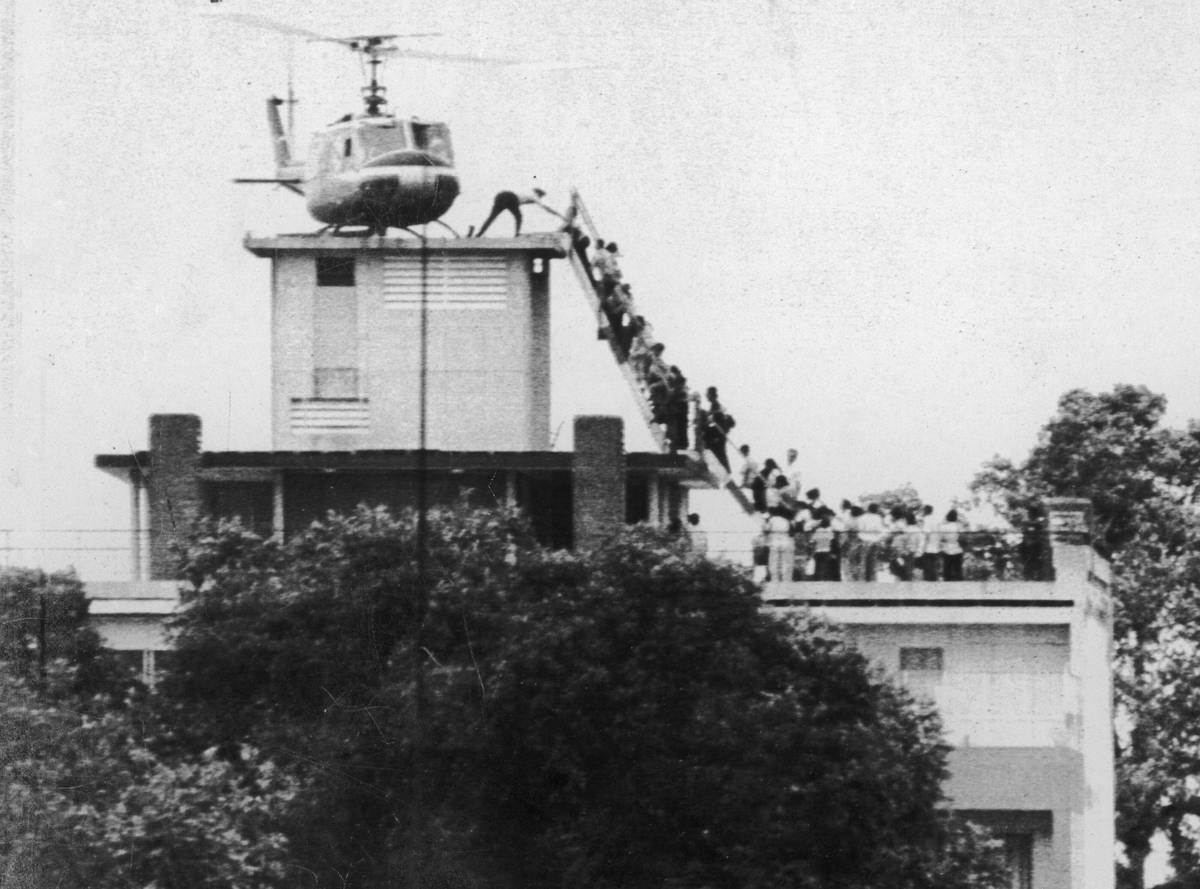 Slavná fotografie z 30. dubna 1975. Zatímco komunistické jednotky vstupovaly do Saigonu a blížily se k prezidentskému paláci a americkému velvyslanectví, poslední americká helikoptéra evakuovala poslední lidi. Snímek pořídil fotograf agentury UPI Hubert van Es. Mnoho lidí se mylně domnívá, že jde o střechu amerického velvyslanectví. Ve skutečnosti jde o dům, kde bydleli zaměstnanci agentury USAID a zástupce šéfa saigonské pobočky CIA.