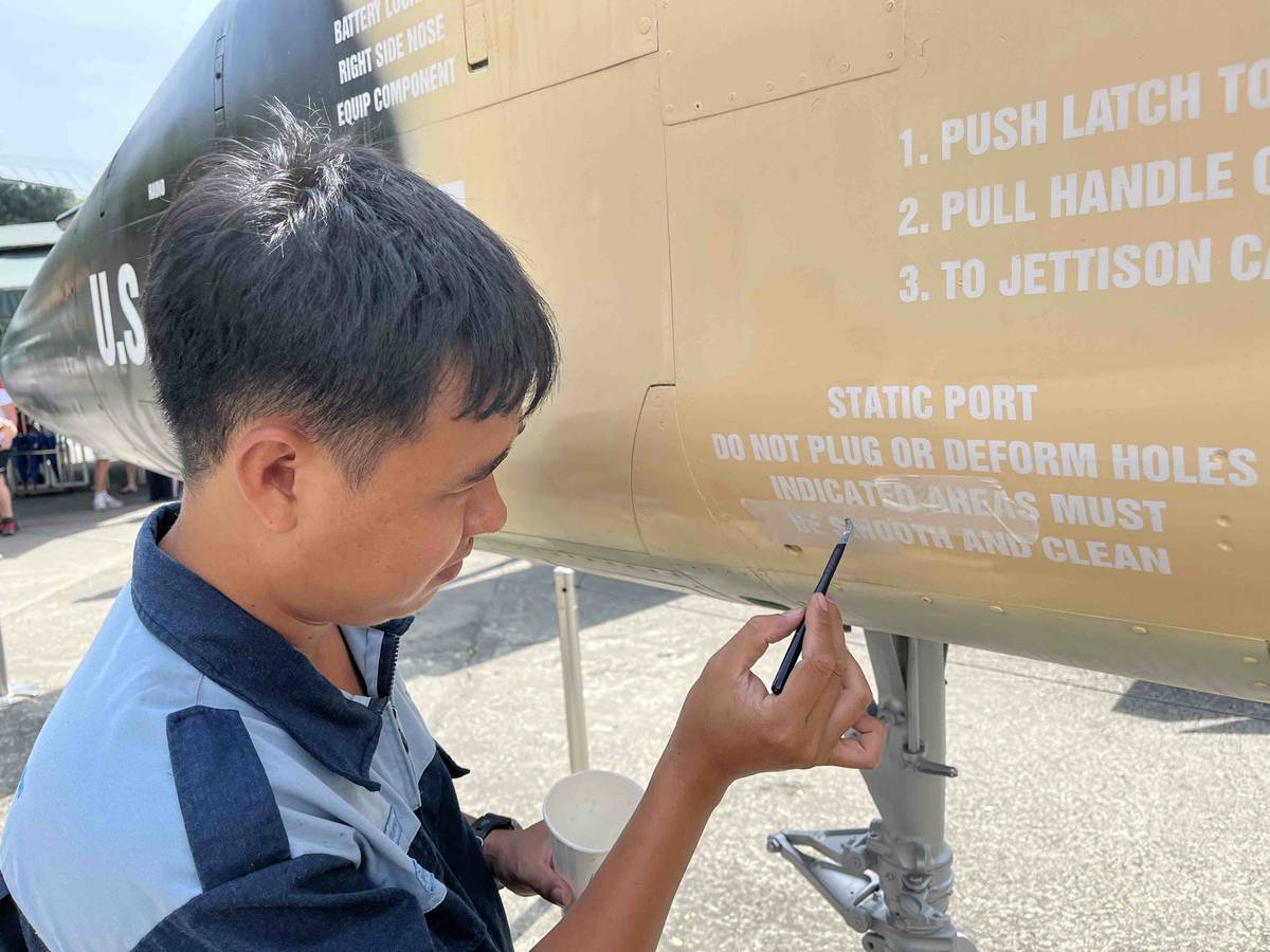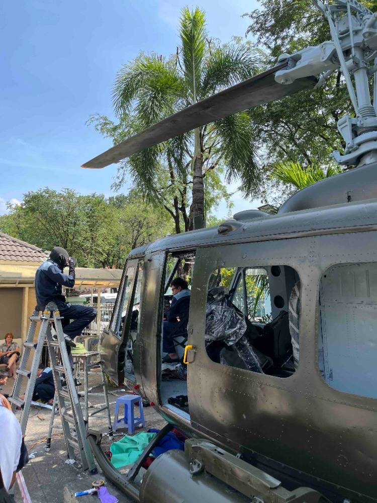 Obnova původních nápisů na americké helikoptéře v Muzeu válečných pozůstatků.