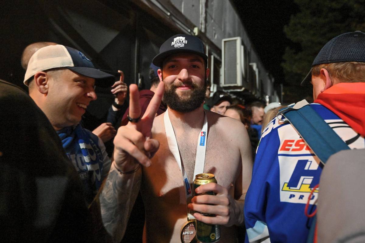 Titul v hokejové extralize vyhrála Kometa, která vyřadila bohatší soupeře Spartu i Pardubice. Na snímku je klíčový obránce jízdy za zlatem Libor Zábranský mladší po příjezdu do Brna. Oslavy právě začínaly, oblečení odkládal. Ale medaili nikde neodložil, tu nechal na krku.