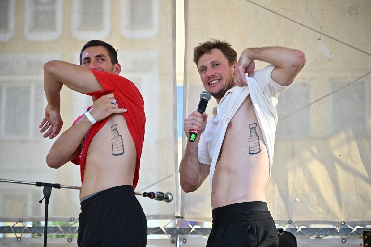Stanley Cup vyhráli s Floridou dva Češi - (zleva) Tomáš Nosek s Vítkem Vaněčkem. Vyhrát NHL je nejtěžší disciplínou v hokeji, takže si trofej nechali i oba zvěčnit na levý bok.