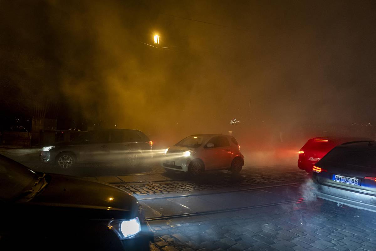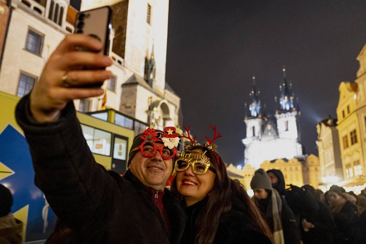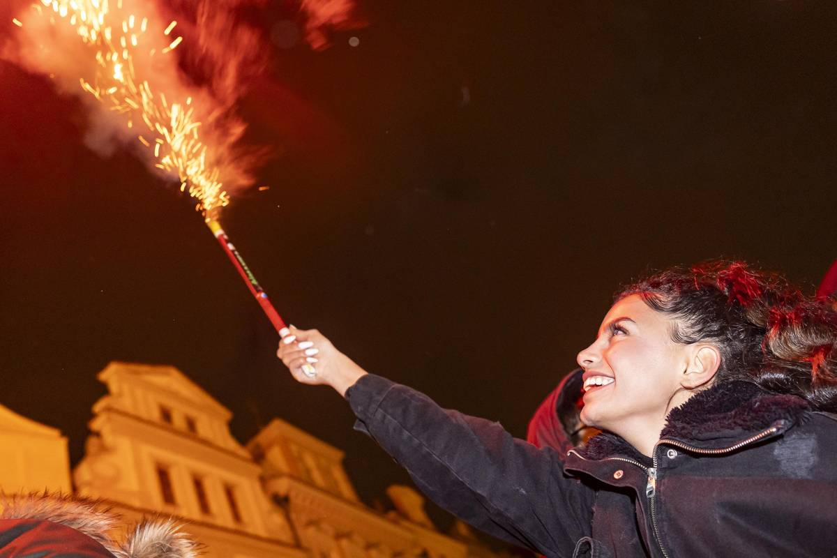 Silvestrovská atmosféra v historických ulicích Prahy krátce po půlnoci.