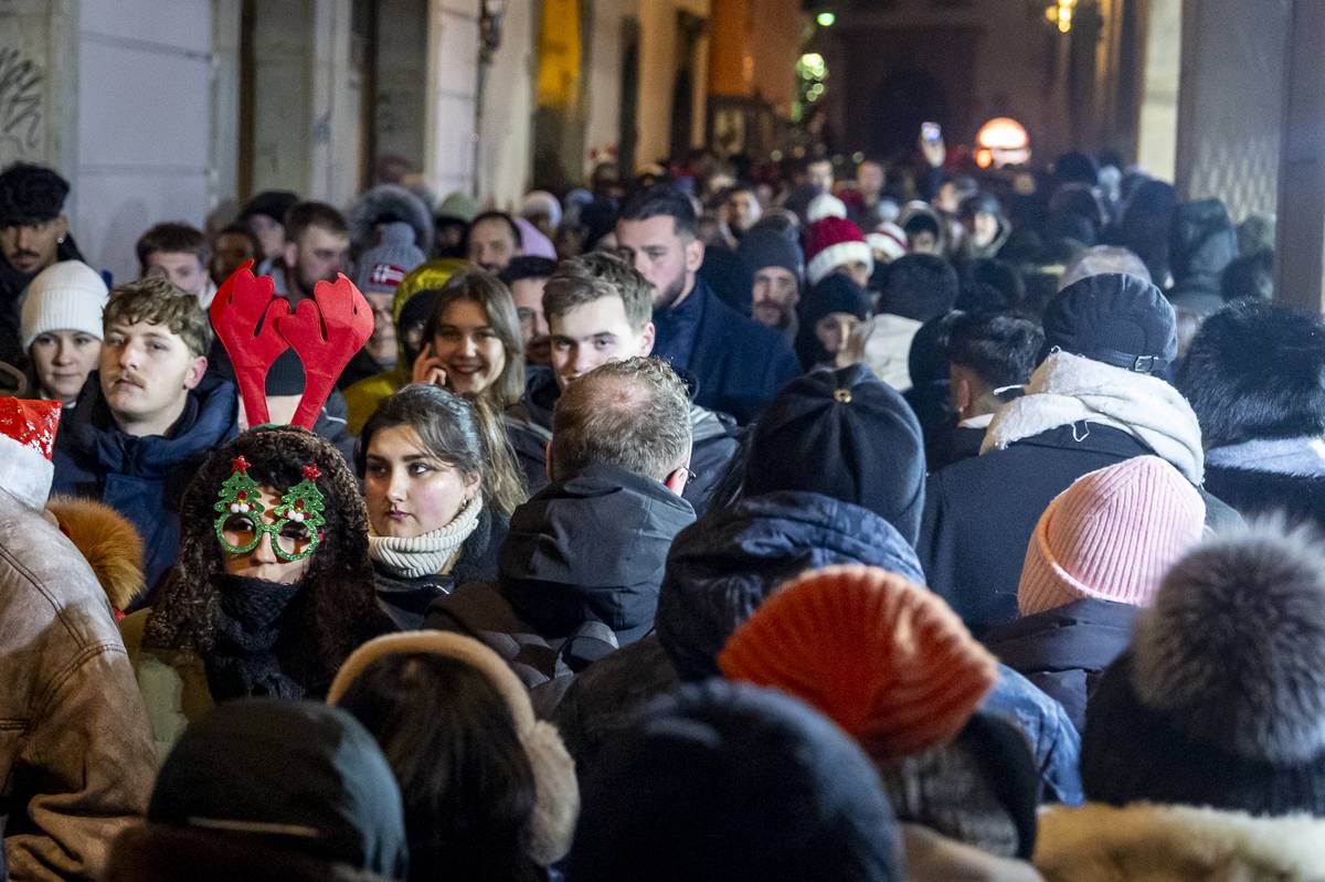 Skupiny přátel slaví přelom roku v centru města.