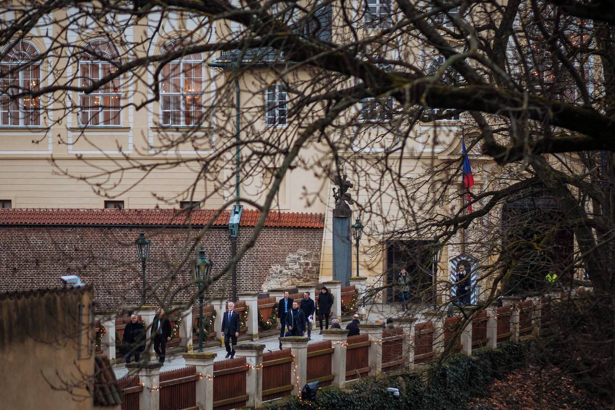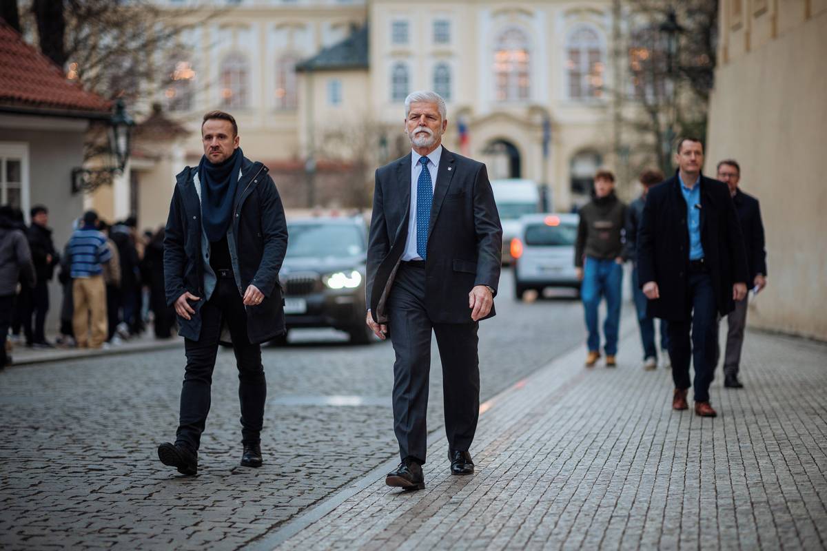 Prezident Petr Pavel prochází se svým týmem a ochrankou ulicí U Prašného mostu.