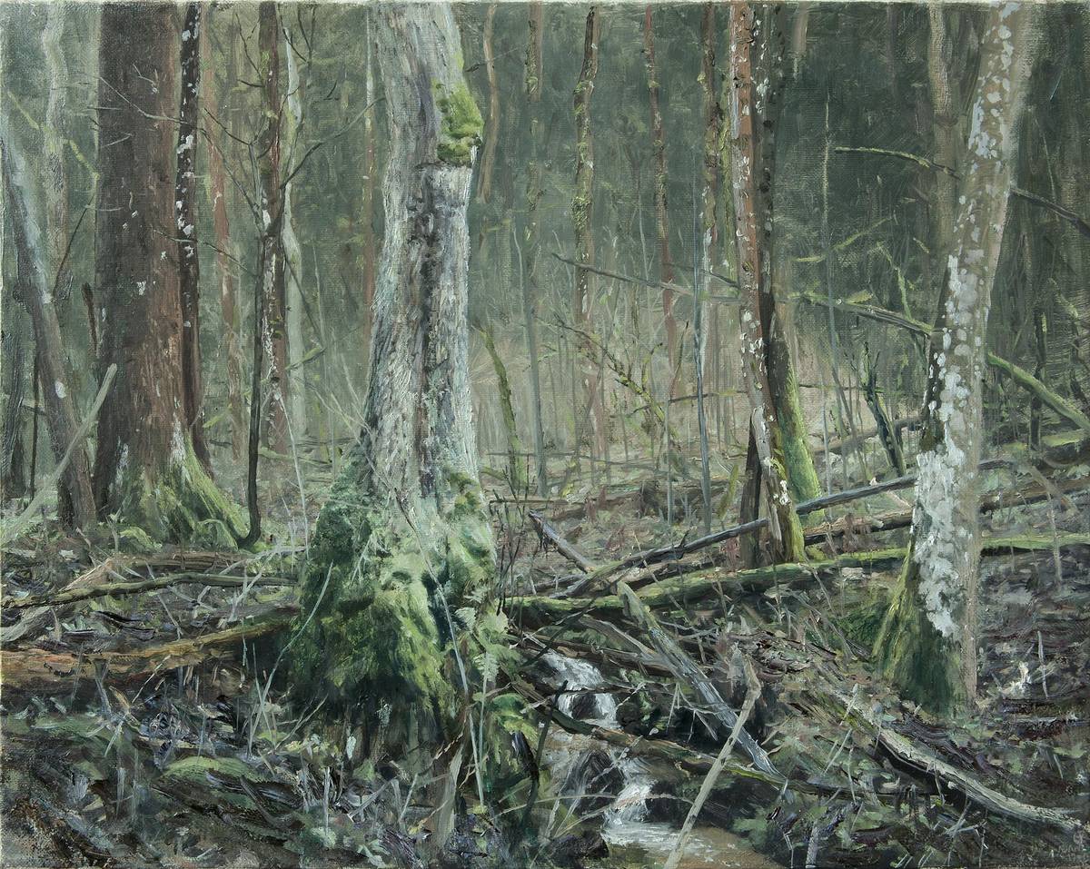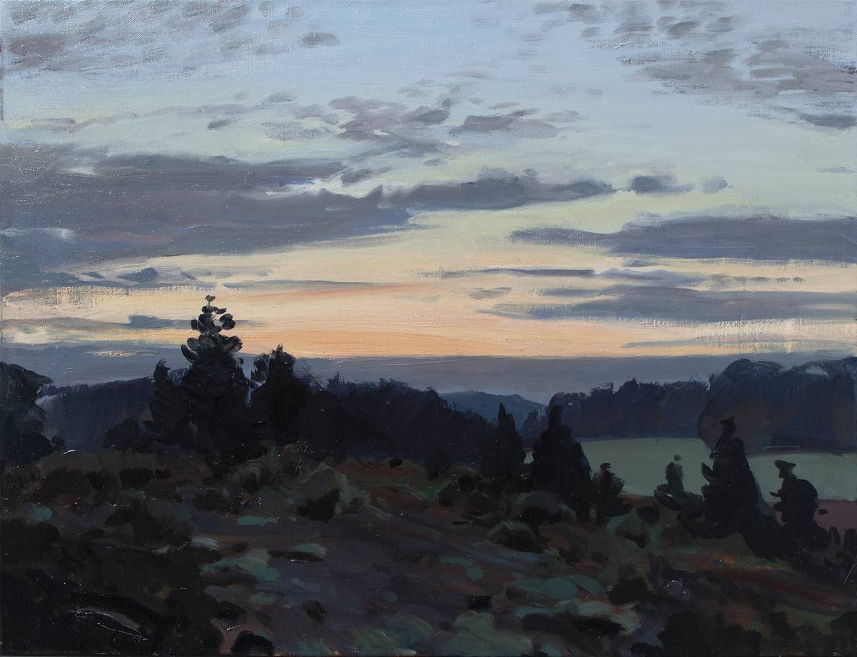 Úsvit nad mýtinou (Tomáš Honz; olej na plátně, 2023)