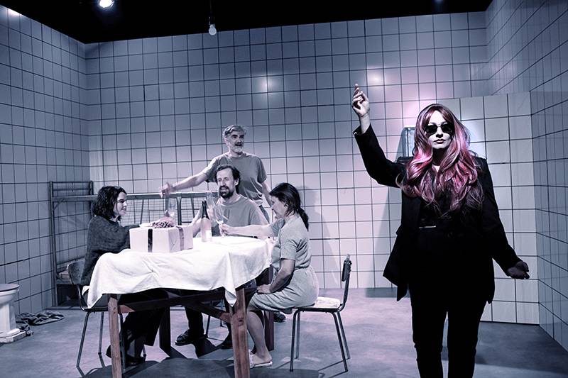 Antonie Formanová, Pavel Šimčík, Martin Myšička, Lada Jelínková a Anna Fialová ve hře Nitero. Jde o představení Dejvického divadla.