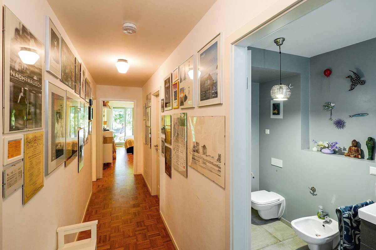K bytu se z výtahu přichází po příjemně otevřené chodbě – pavlači a za vstupními dveřmi je dlouhá chodba.