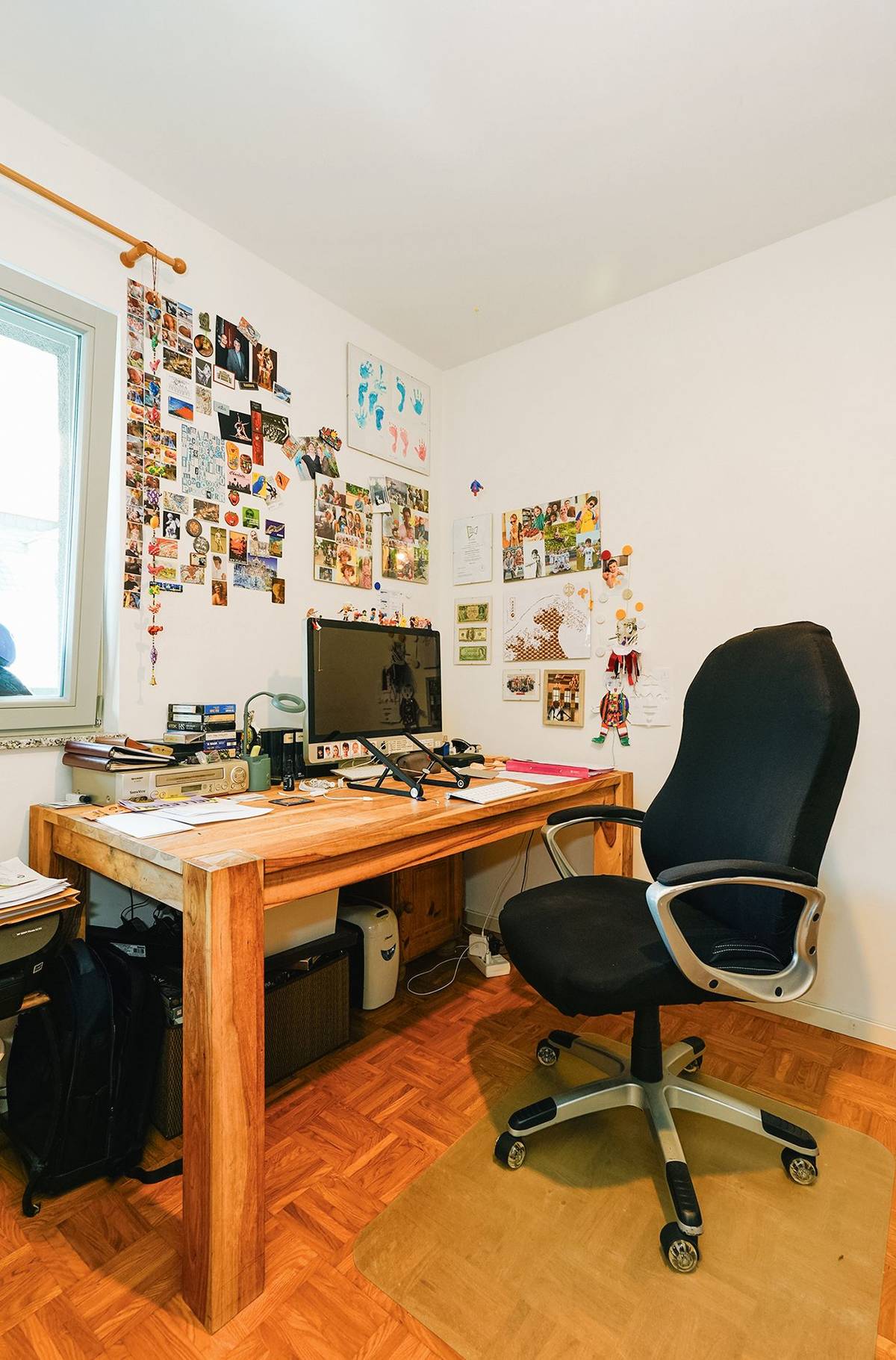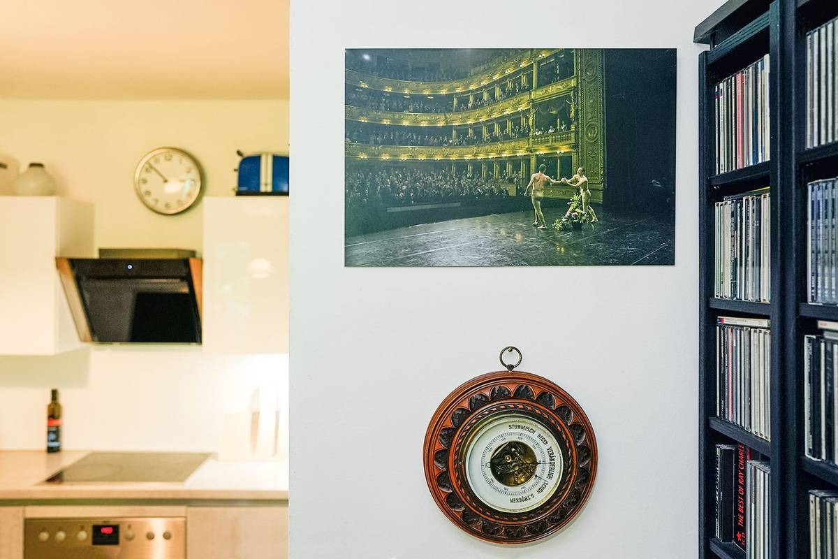 Velká okna v novostavbě bytového domu prostor opticky zvětšují i v obývacím pokoji s kuchyní. Knihovna je putovní a byla i v minulých, pronajatých bytech.