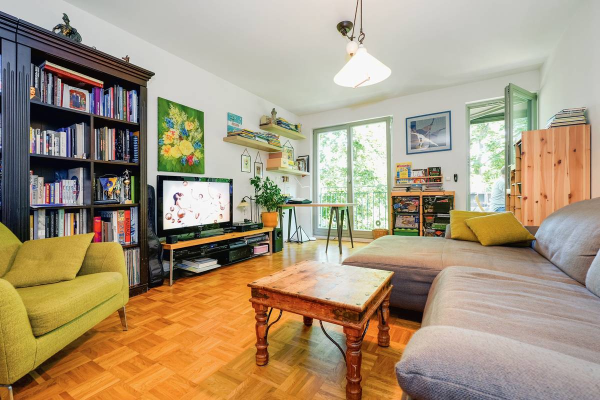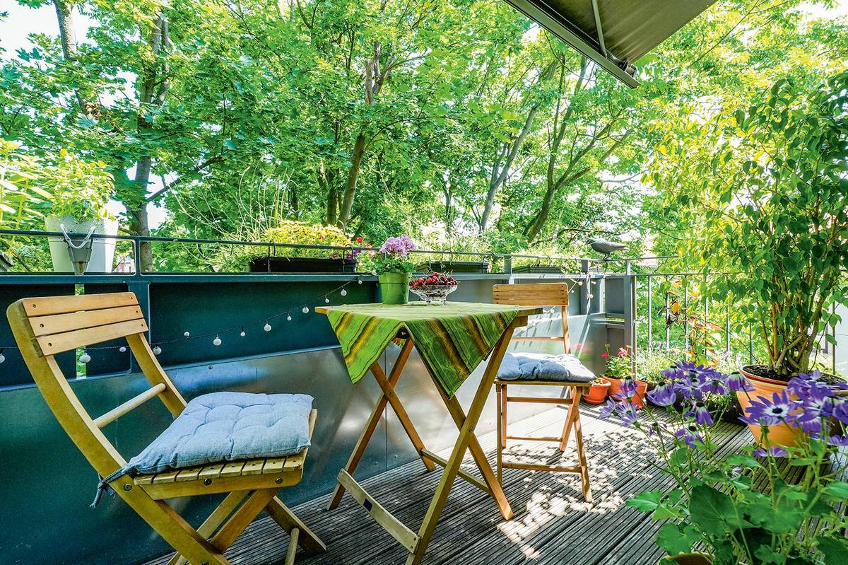 Balkonek je zařízený k příjemnému posezení v zeleni. Navíc se na něj vstupuje z obýváku i z ložnice.