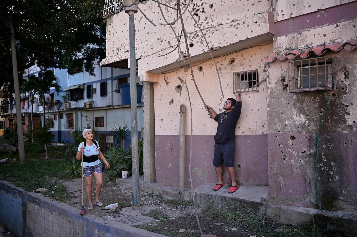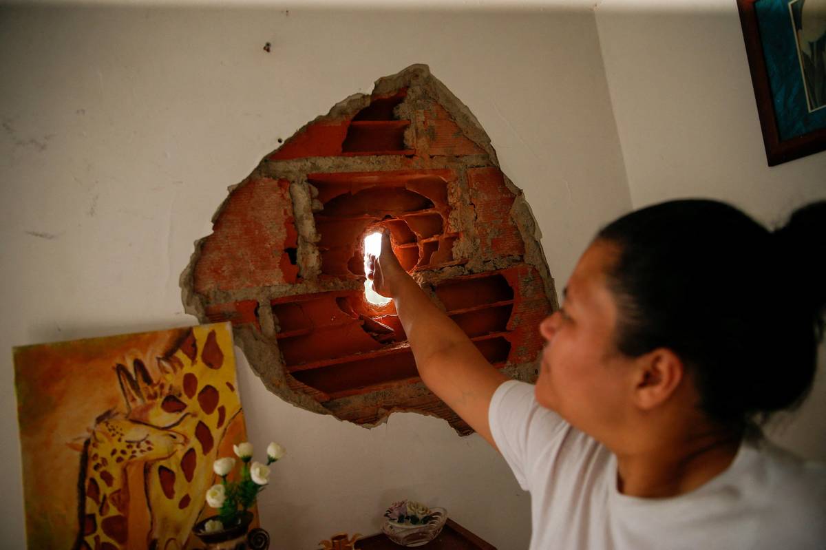 (Žena ukazuje díru ve svém domě po útoku USA na Venezuelu. Caracas, Venezuela, 4. ledna.)