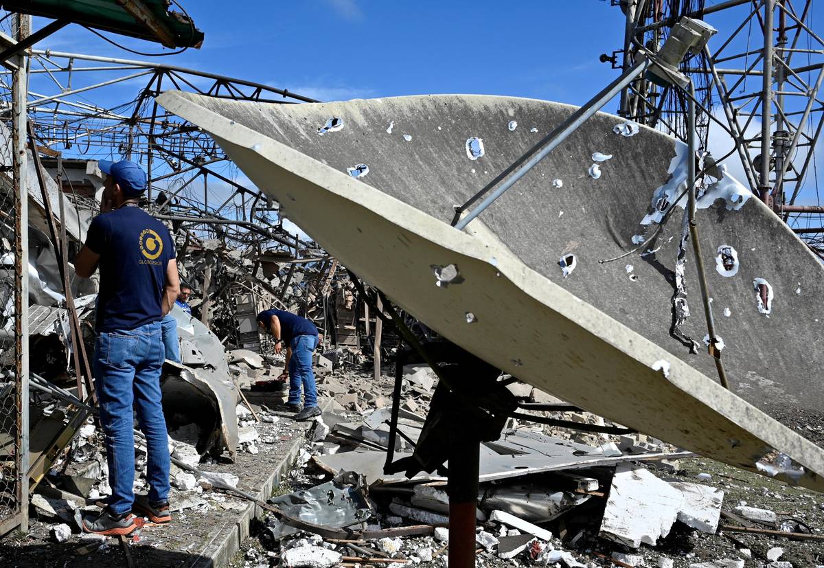 Zaměstnanci stojí poblíž trosek antény poté, co americký útok zničil televizní a telefonní věž, která se zřítila na dům jejího operátora Carlose Bracha, na předměstí Caracasu, 4. ledna 2026.