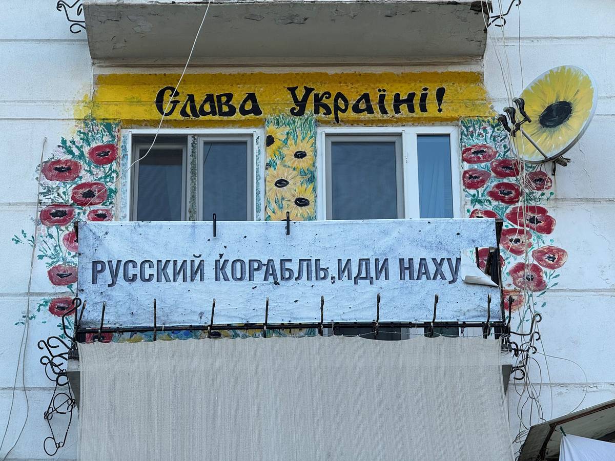 Balkón v Oděse s nápisem „Ruský korábe, táhni“
