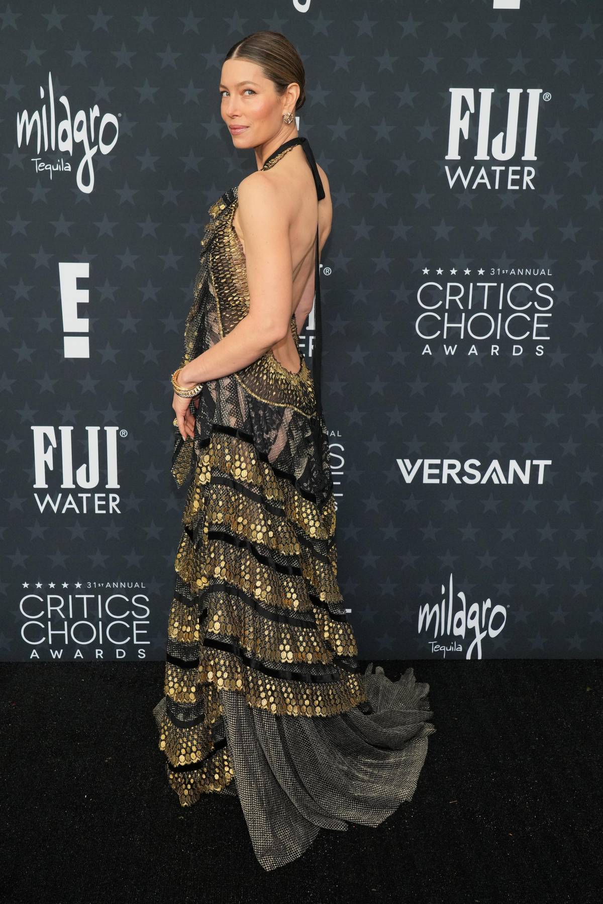 Herečka Jessica Bielová ohromila na Critics Choice Awards 2026 v sexy černo-zlatých šatech od Lanvin.