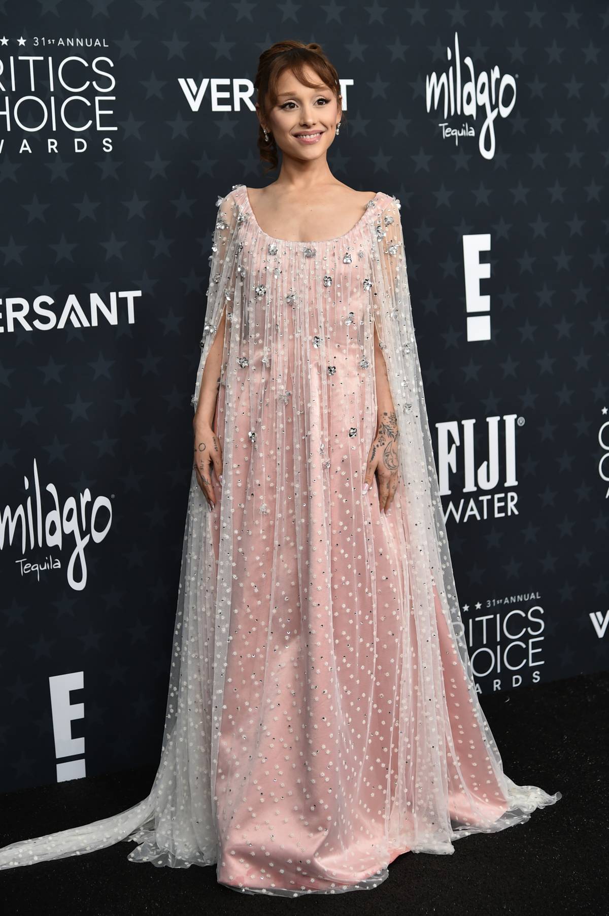 Ariana Grande měla šaty italské návrhářky Alberty Ferretti v jemné růžové barvě překryté tylovým průsvitným pláštěm zdobeným krystaly.
