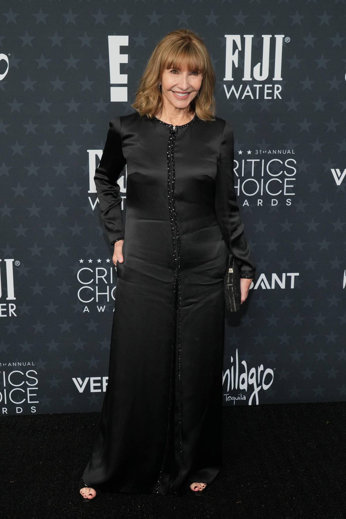 Americká herečka a komička Mary Steenburgenová v elegantních černých šatech s knoflíčky až na zem.