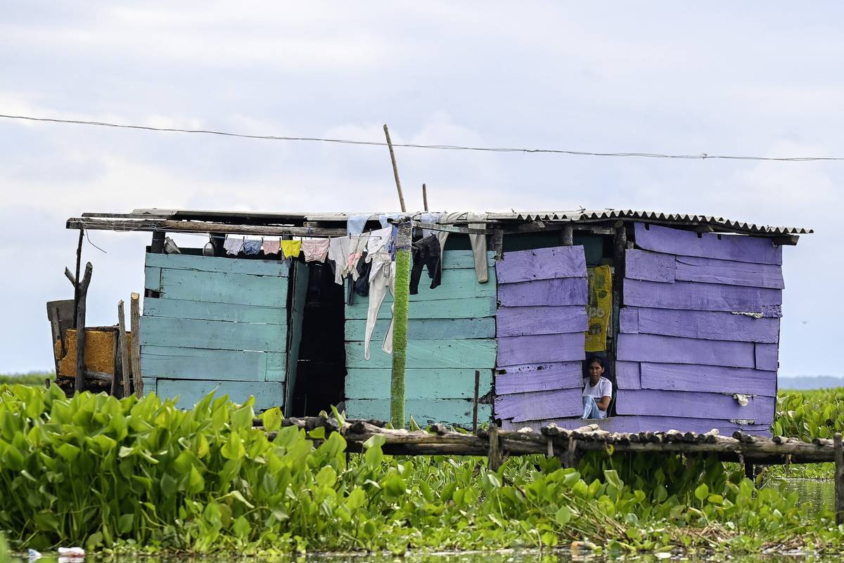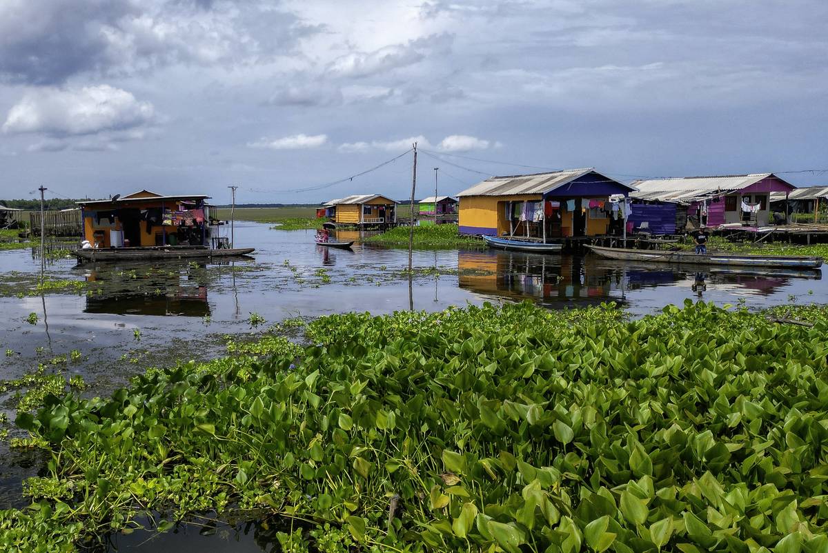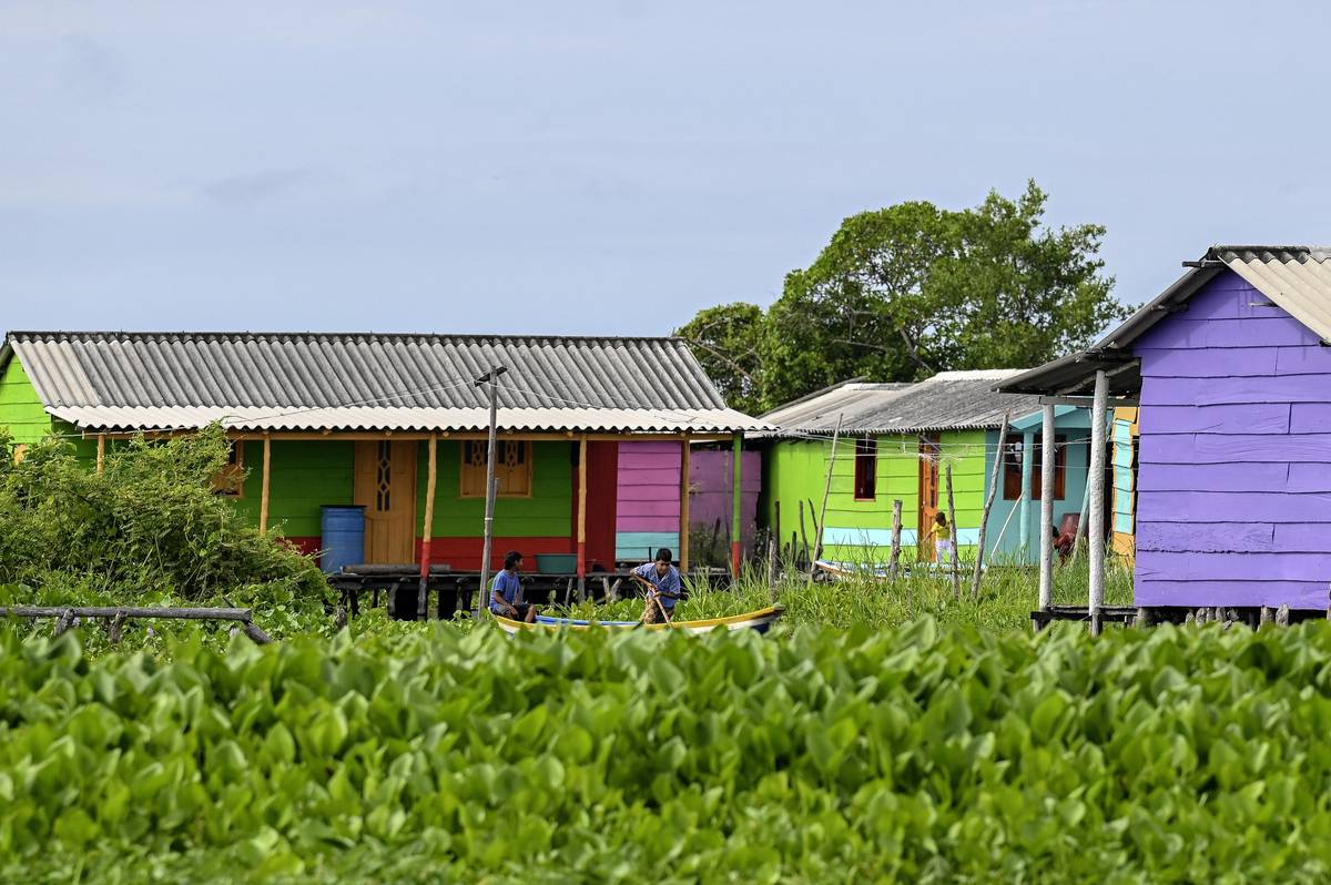 Barevné domy v Nueva Venecia stojí na kůlech v bažině Ciénaga de Pajarales v kolumbijské části Karibiku. Místní obyvatelé se poslední rok potýkají s nečekaným nepřítelem - invazivní rostlinou původem z Asie. (Snímky jsou ze začátku září 2025.)