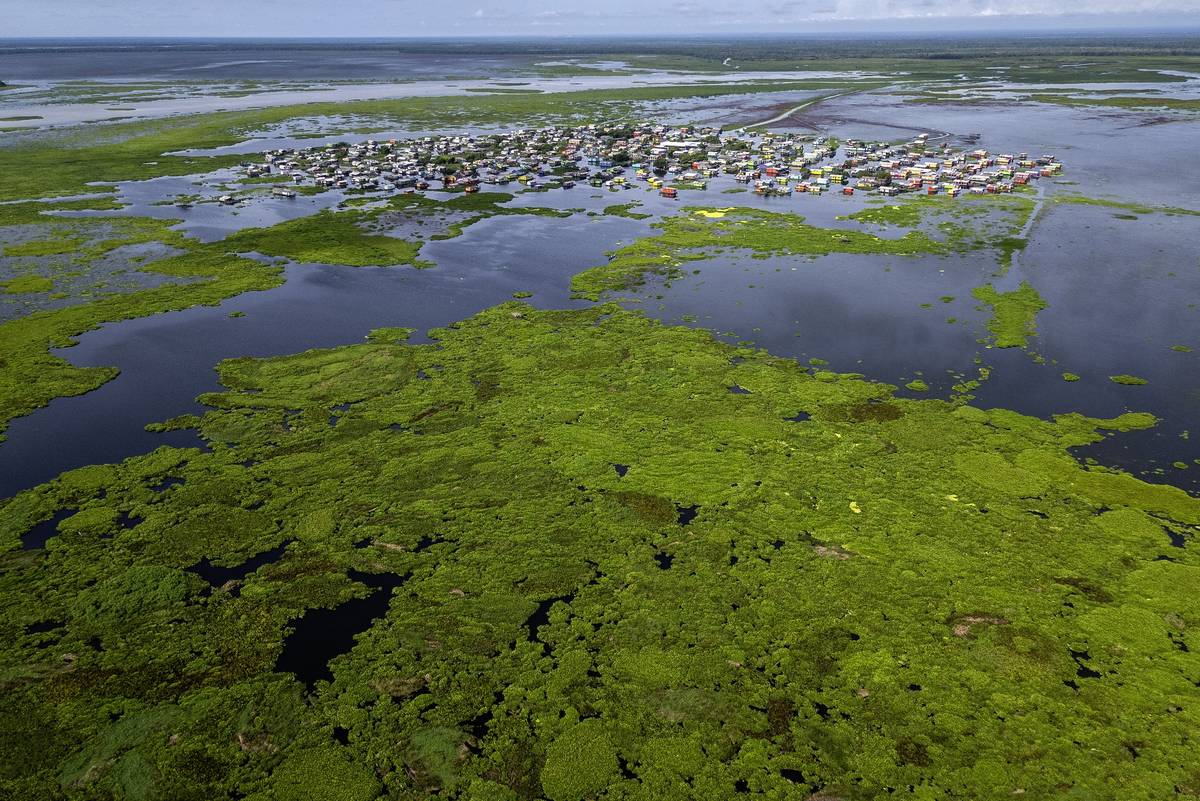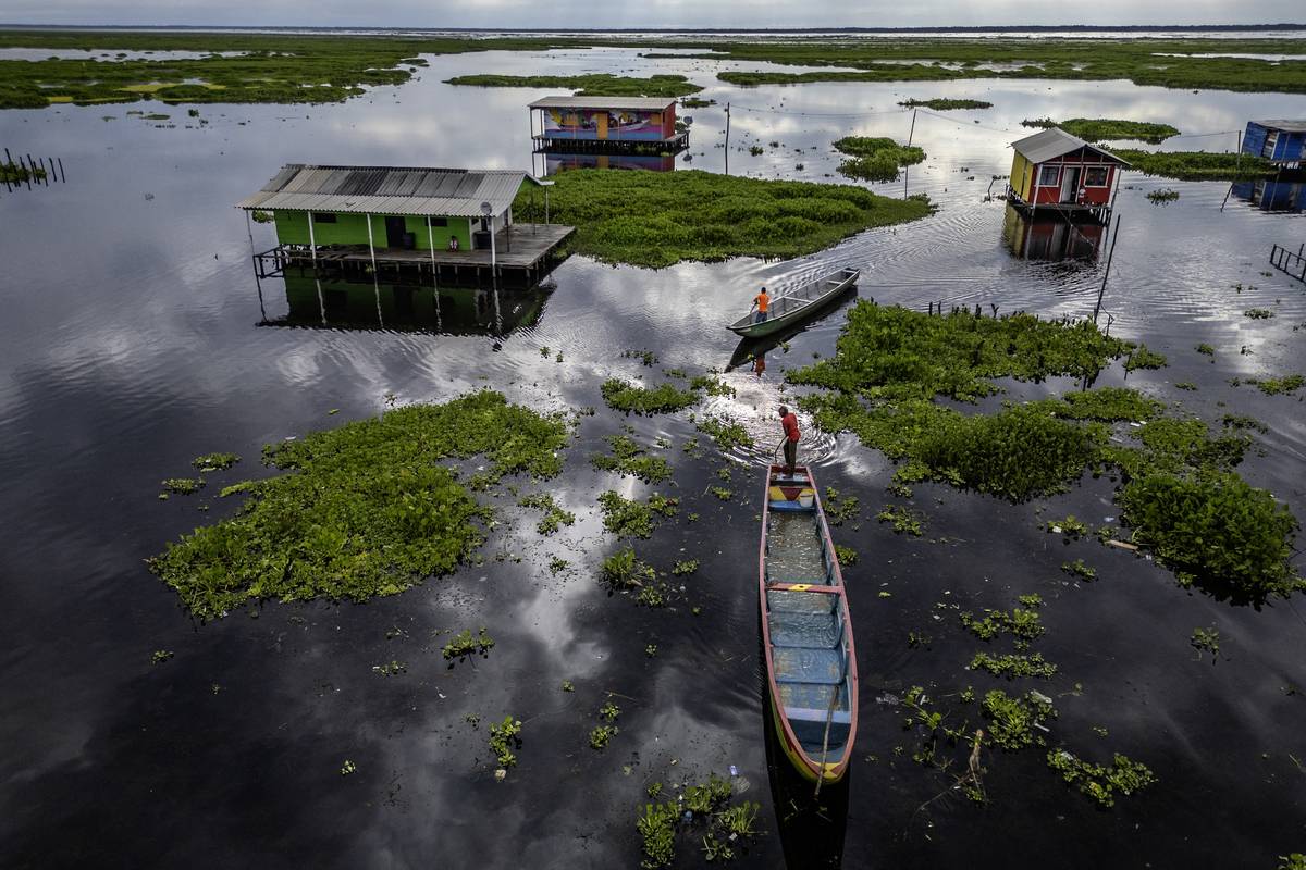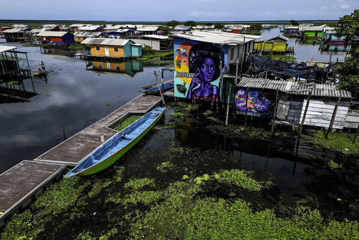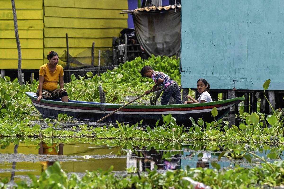 Barevné domy v Nueva Venecia stojí na kůlech v bažině Ciénaga de Pajarales v kolumbijské části Karibiku. Místní obyvatelé se poslední rok potýkají s nečekaným nepřítelem - invazivní rostlinou původem z Asie. (Snímky jsou ze začátku září 2025.)
